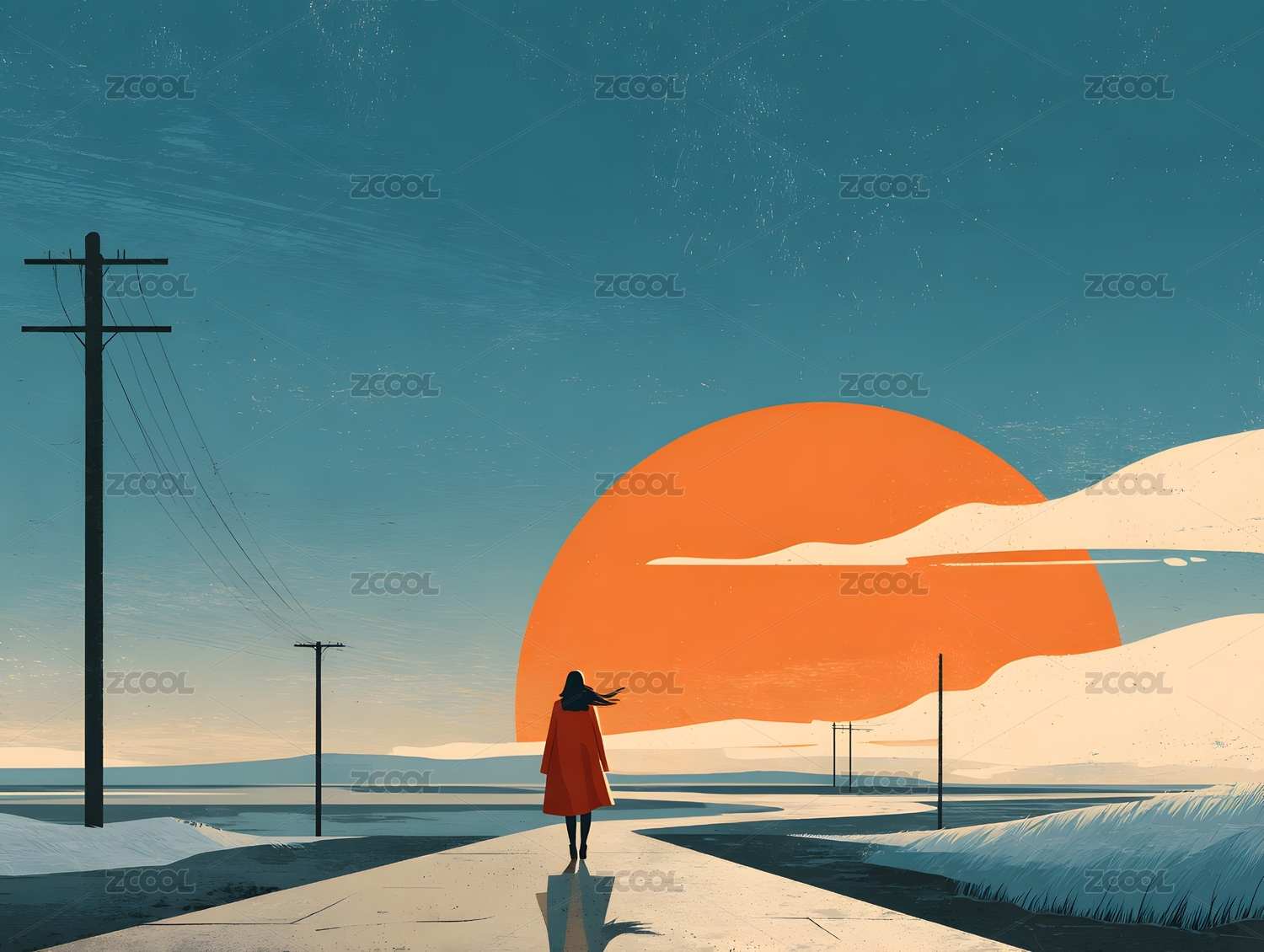 风景,宁静,户外,艺术插画,女子,人物,长发,冬季,自然风光,海边