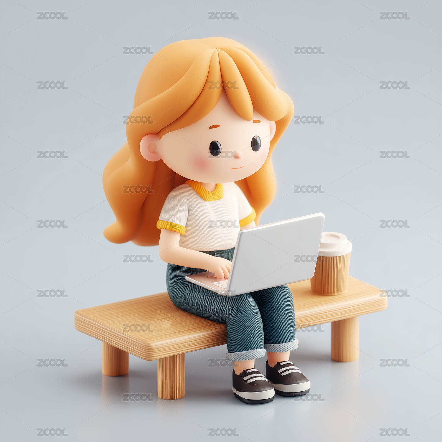 盘腿坐使用电脑双手抱头的女青年3D插画