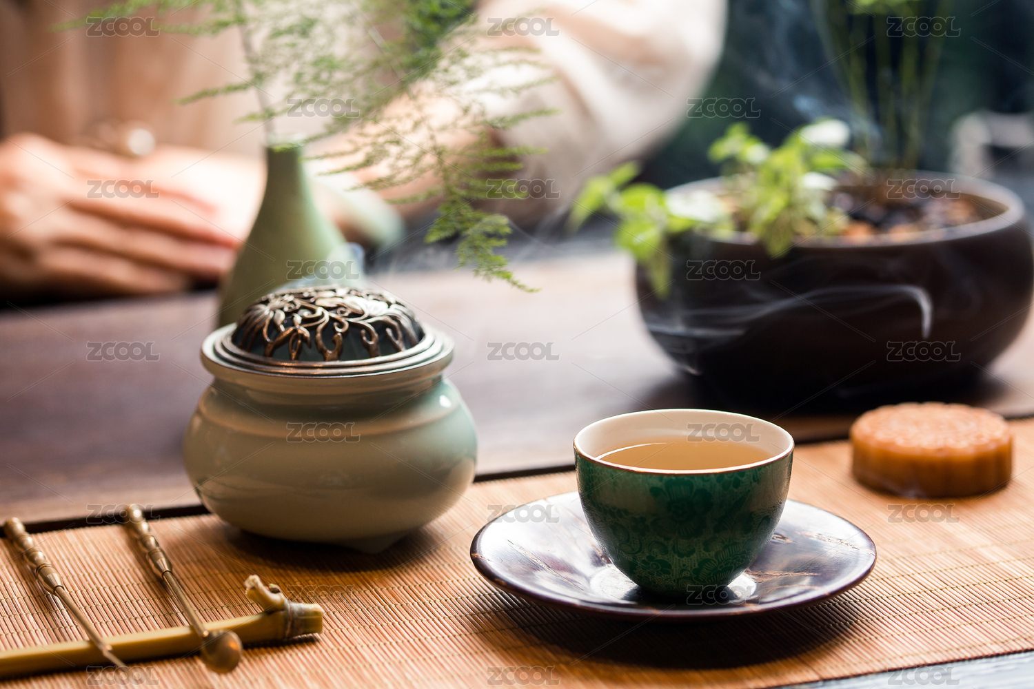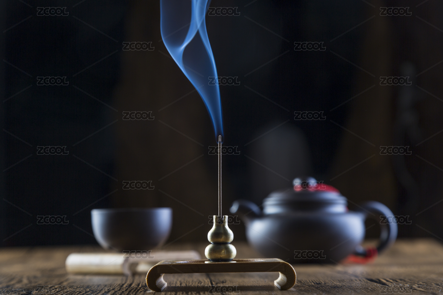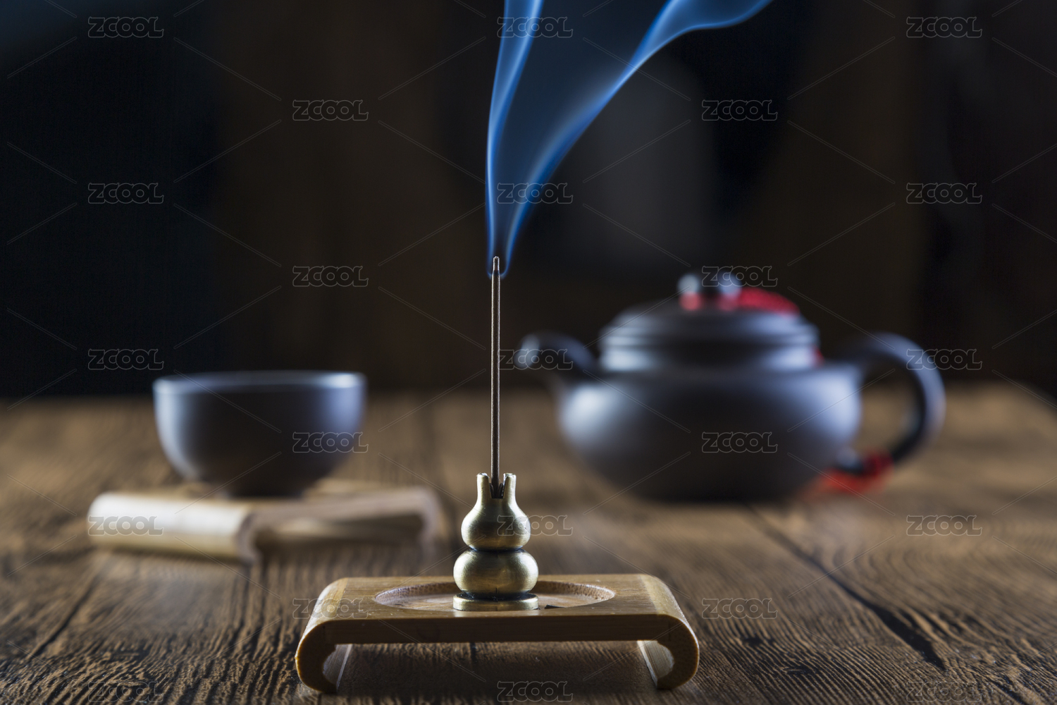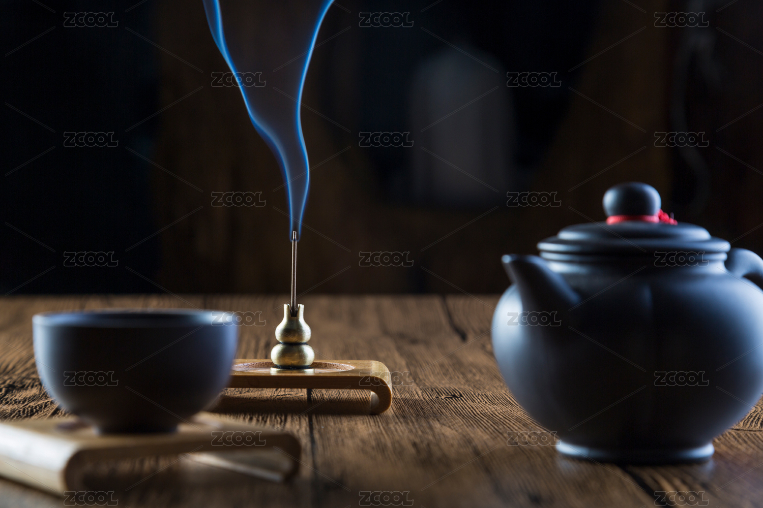 陶瓷茶具和袅袅飘散的沉香烟雾