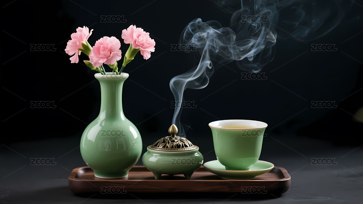 背景,黑色,绿色,植物,烟雾,花瓶,康乃馨,香炉,茶杯,托盘