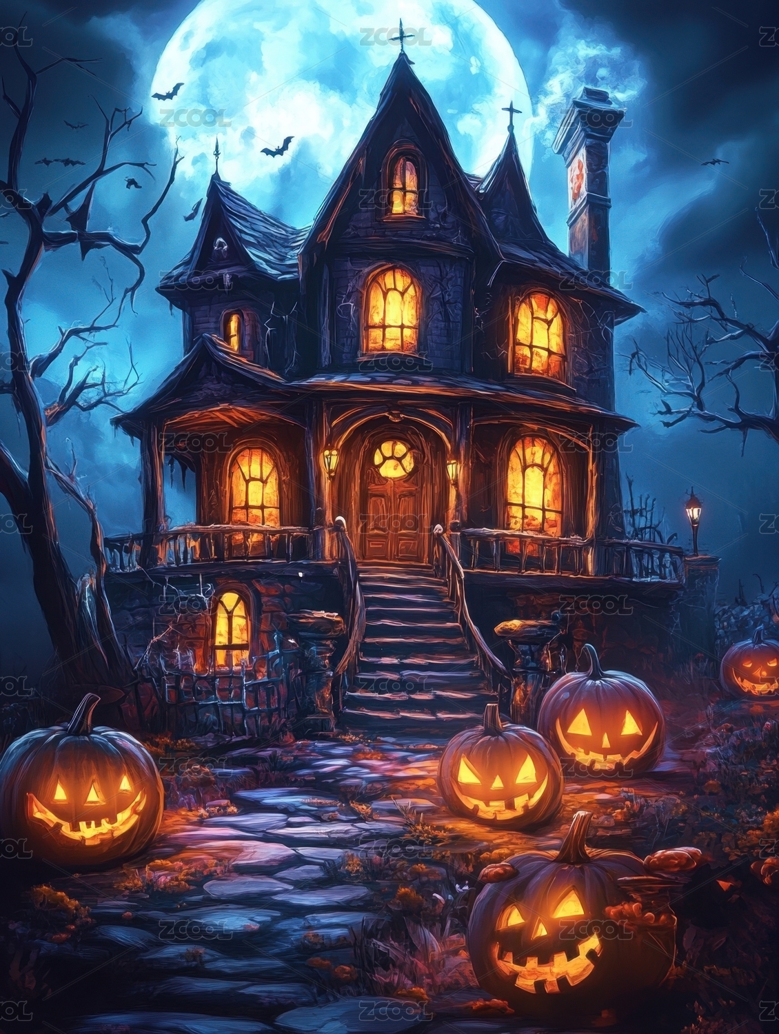 万圣节恐怖房屋夜晚城堡复古装饰节日插画