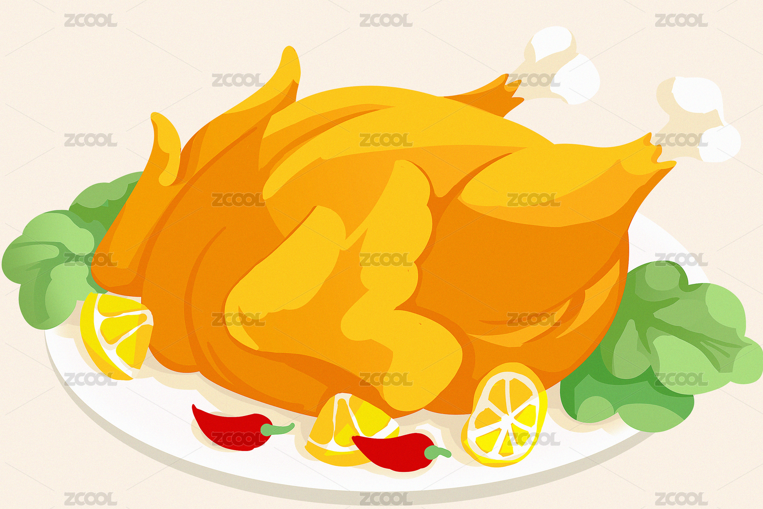 插画,卡通,节日,烤鸡,柠檬,生菜,盘子,食物,美食,美味