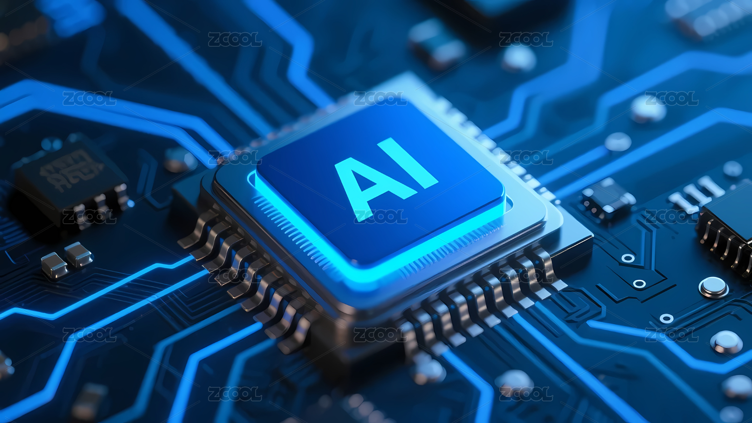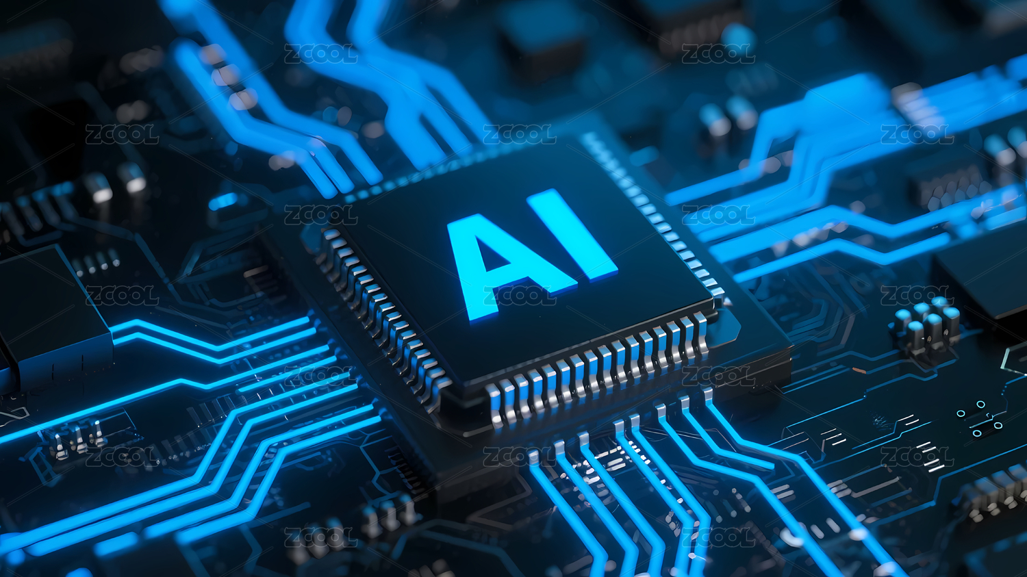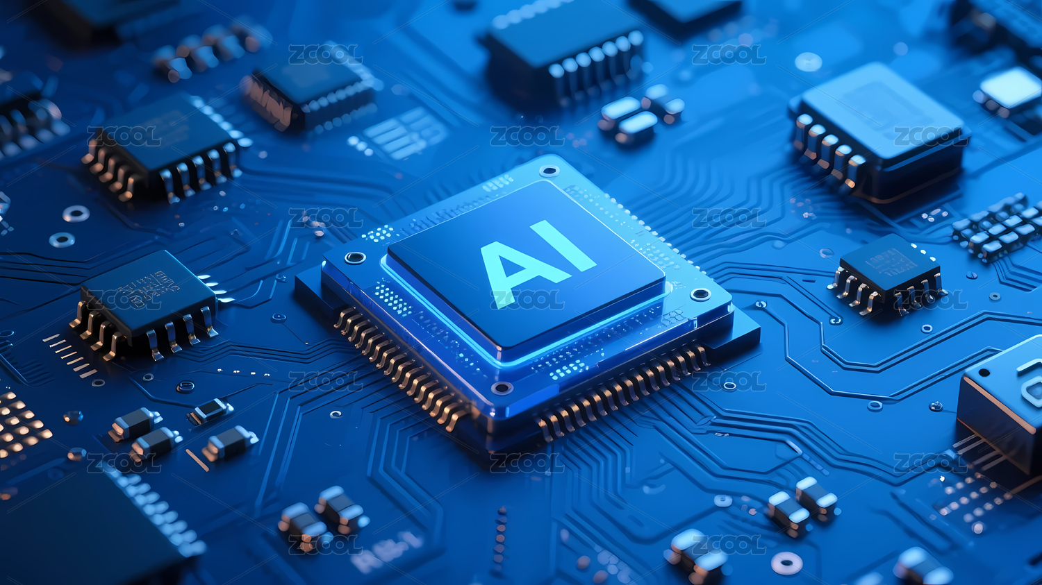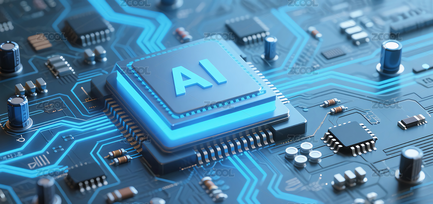 蓝色AI芯片与电路板图案