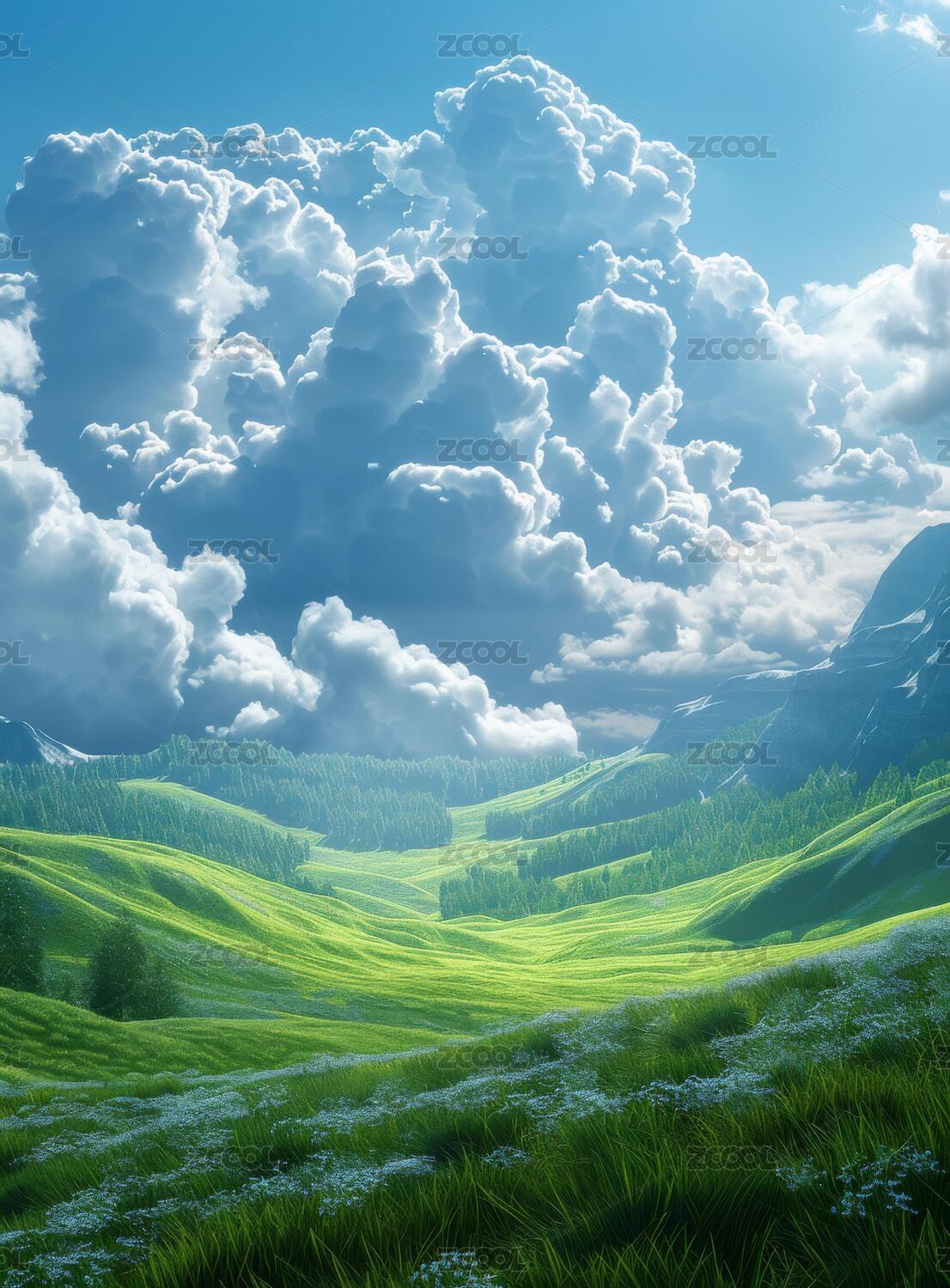 连绵起伏的绿色山丘和一棵大树背景是云朵