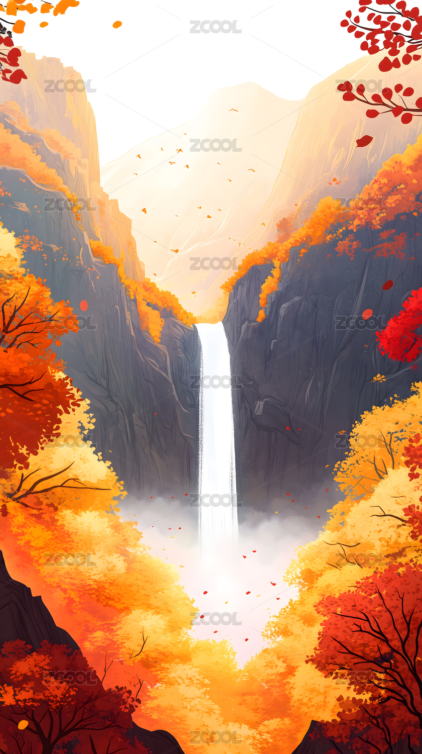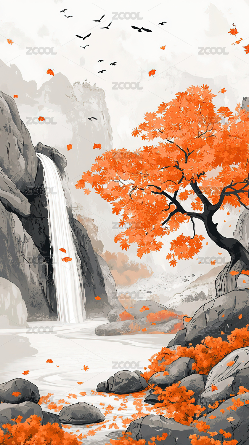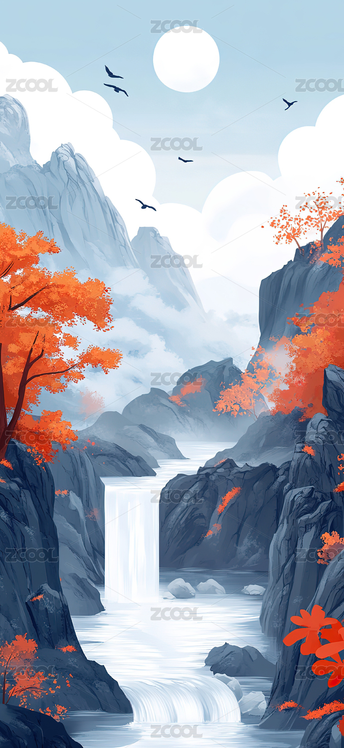 装饰画,艺术,山水,意境,树木,朦胧,云雾,清新,唯美,瀑布