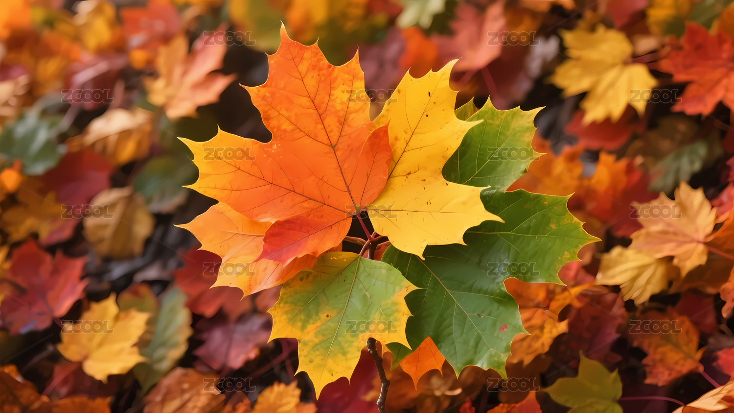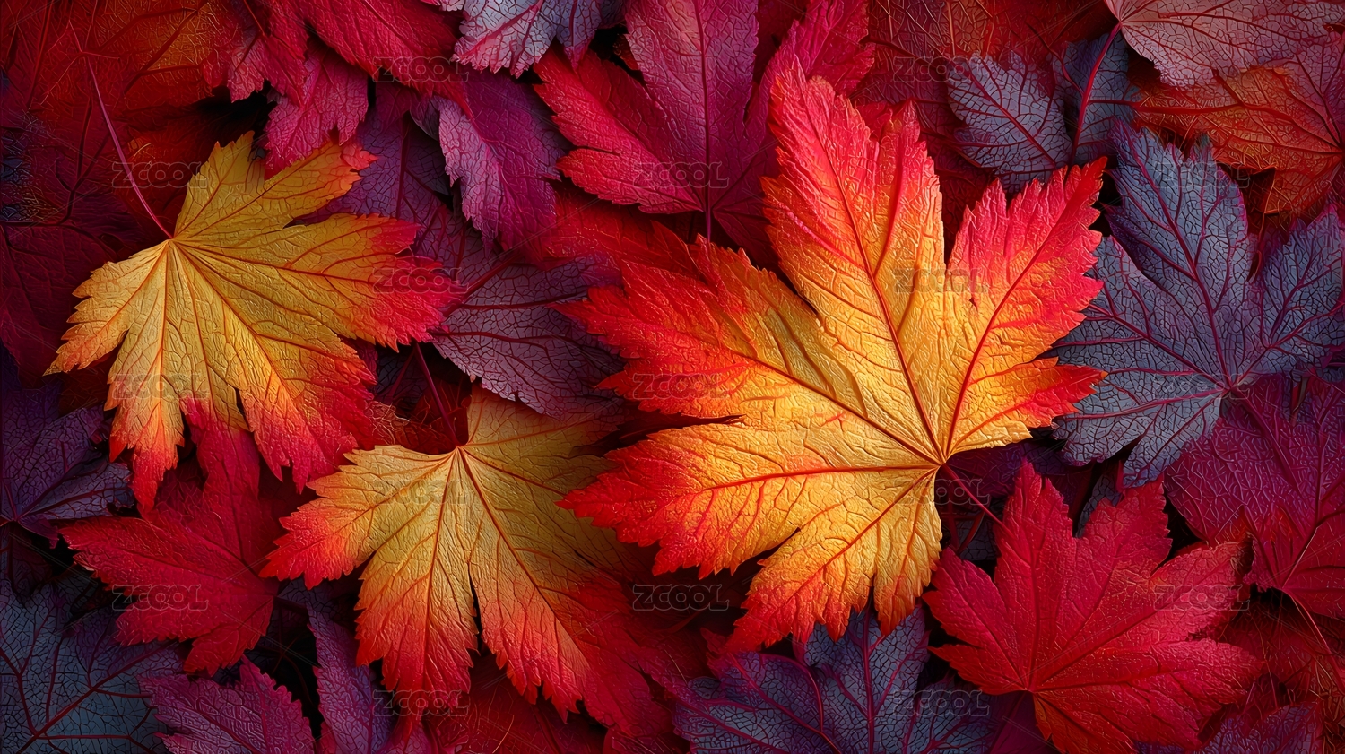 秋日枫叶绚烂色彩 堆叠落叶渲染金秋