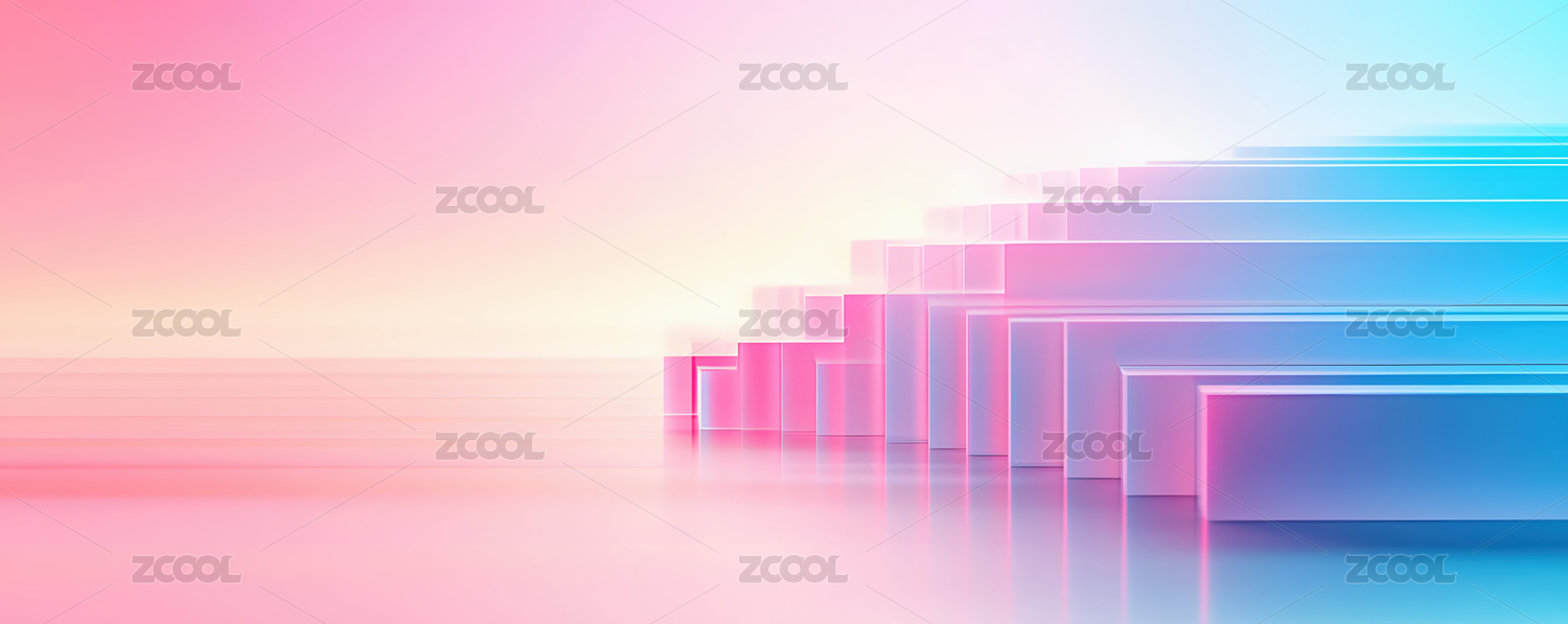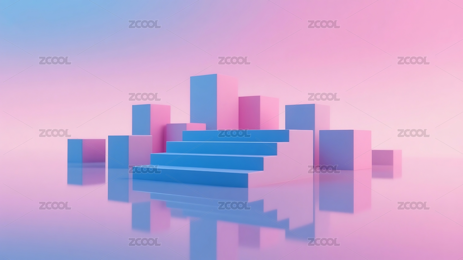 粉蓝渐变背景的立体几何建筑