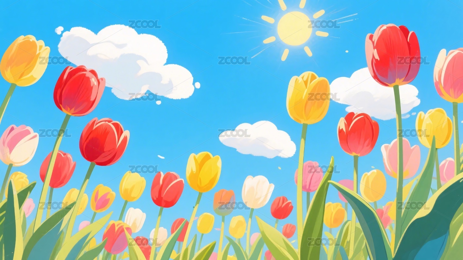 蓝色天空下的郁金香插画