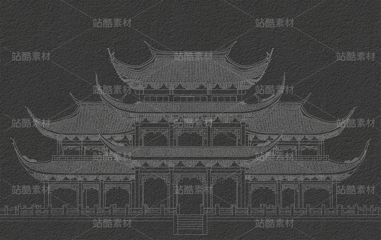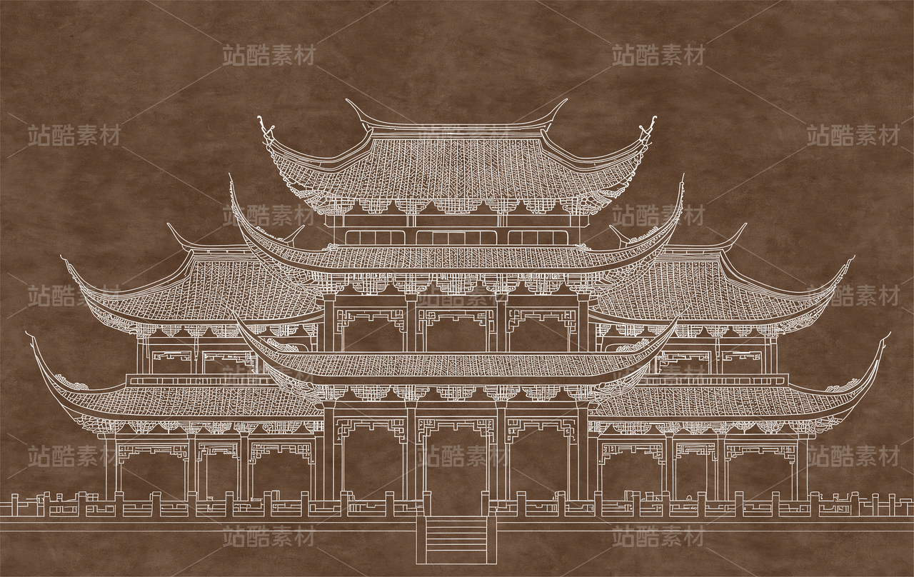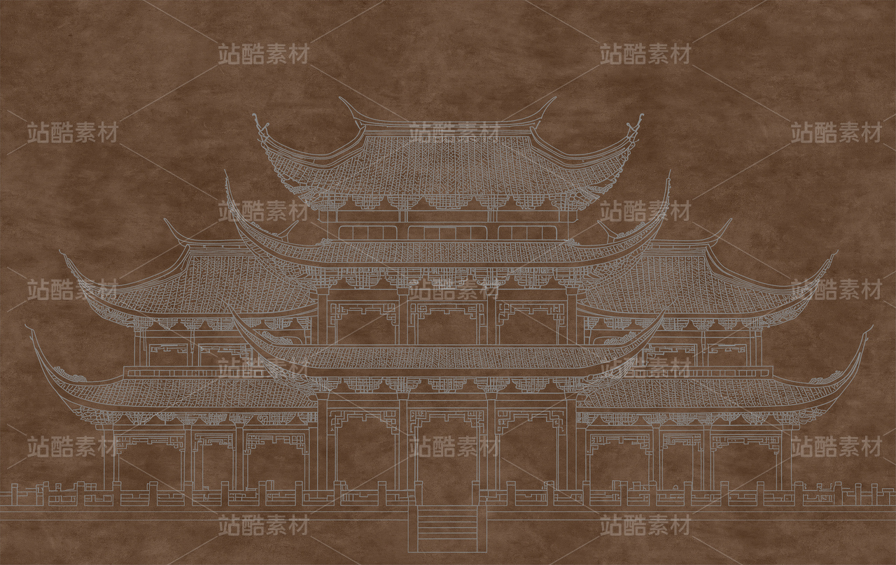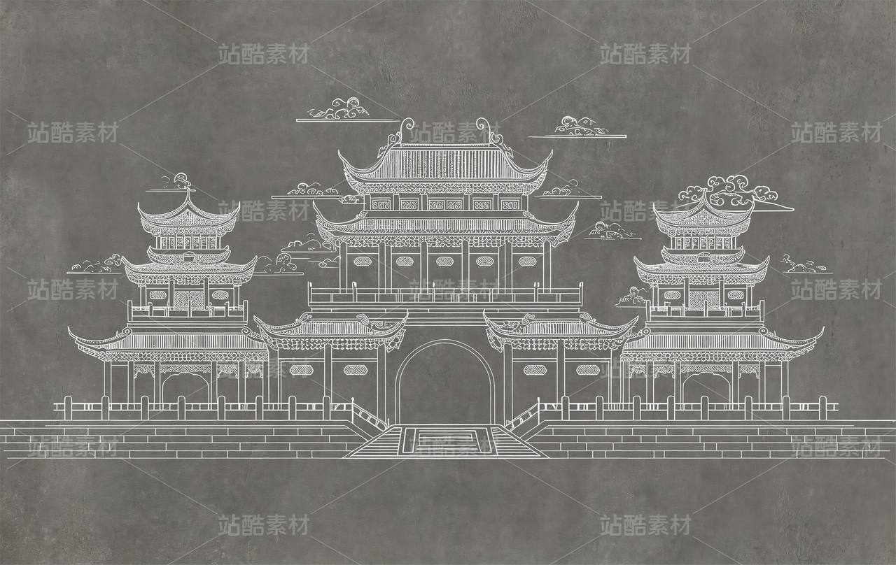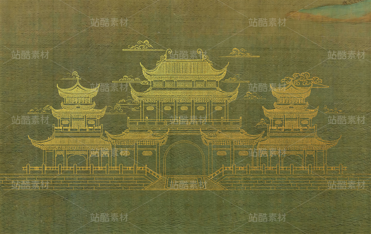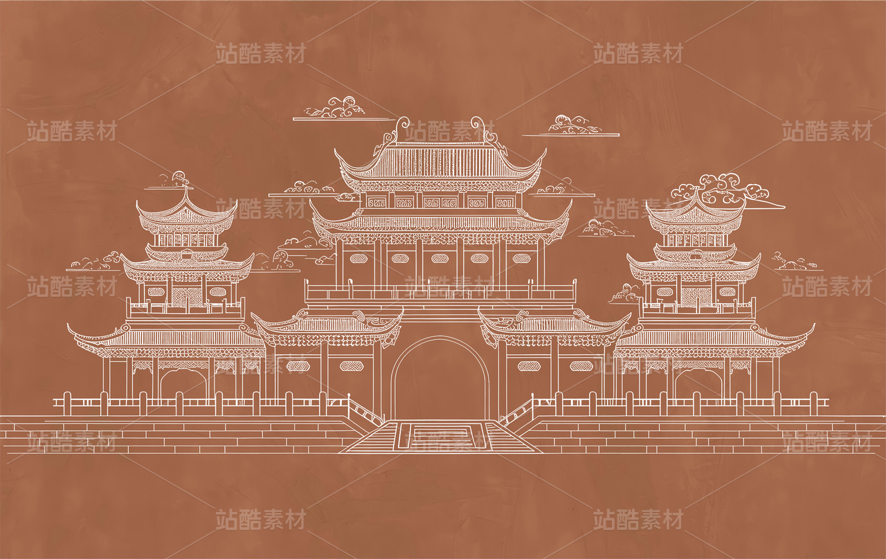 新中式国风亭台楼阁建筑工装背景墙壁画