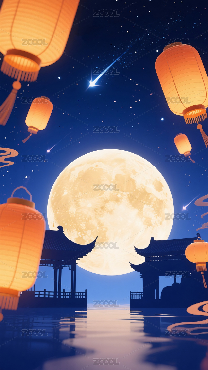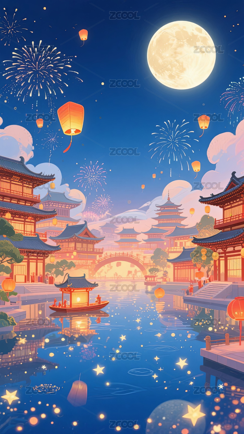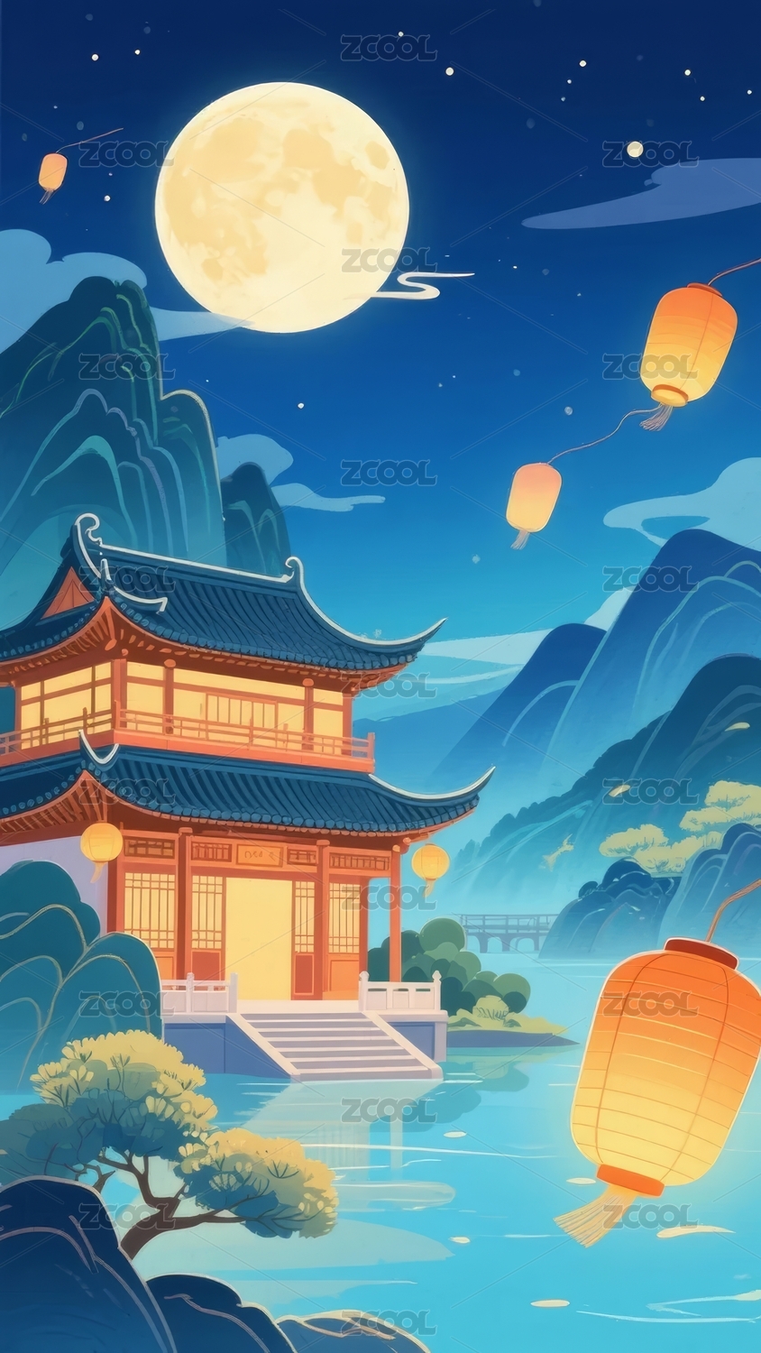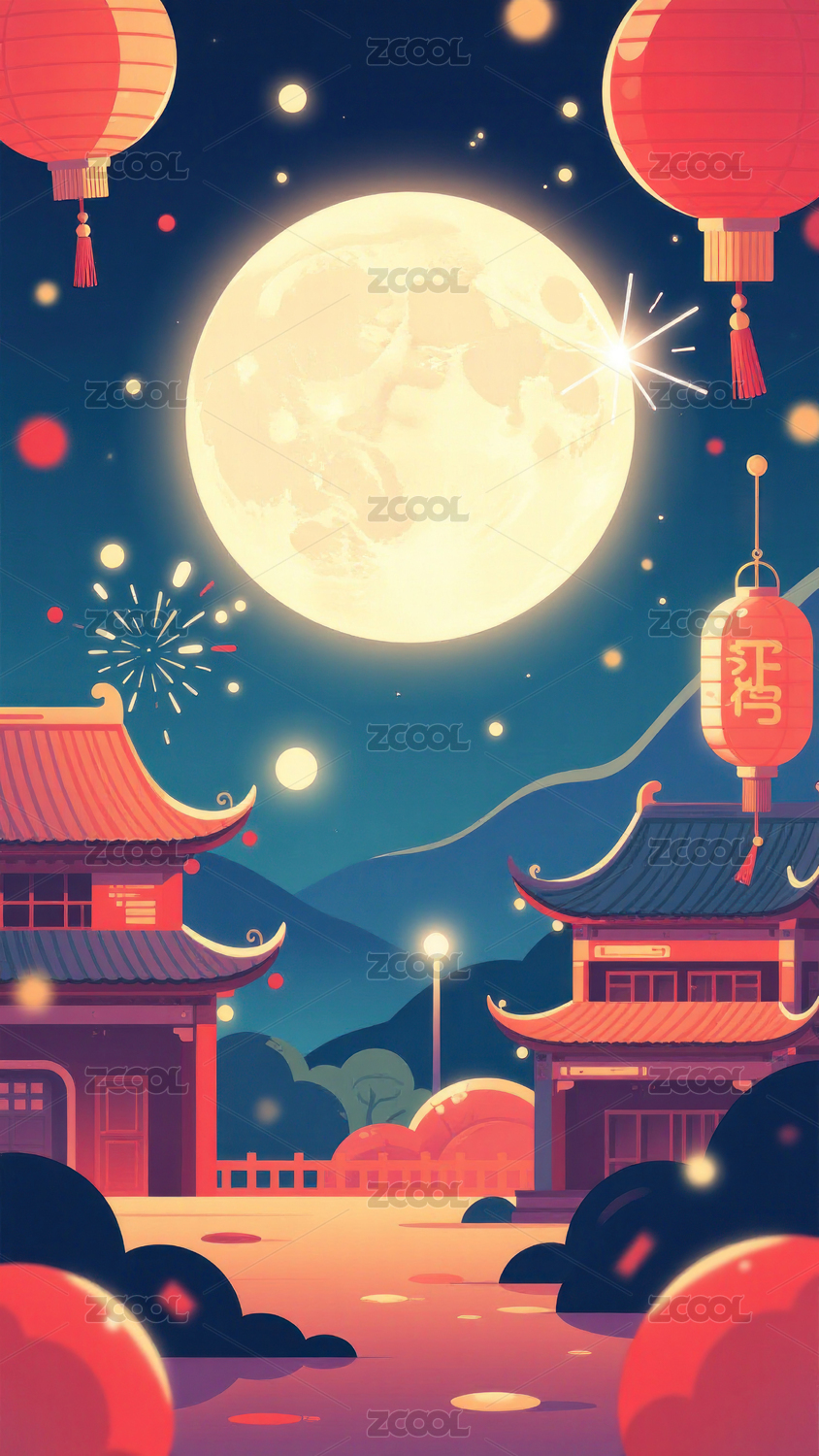 月下古塔与灯笼