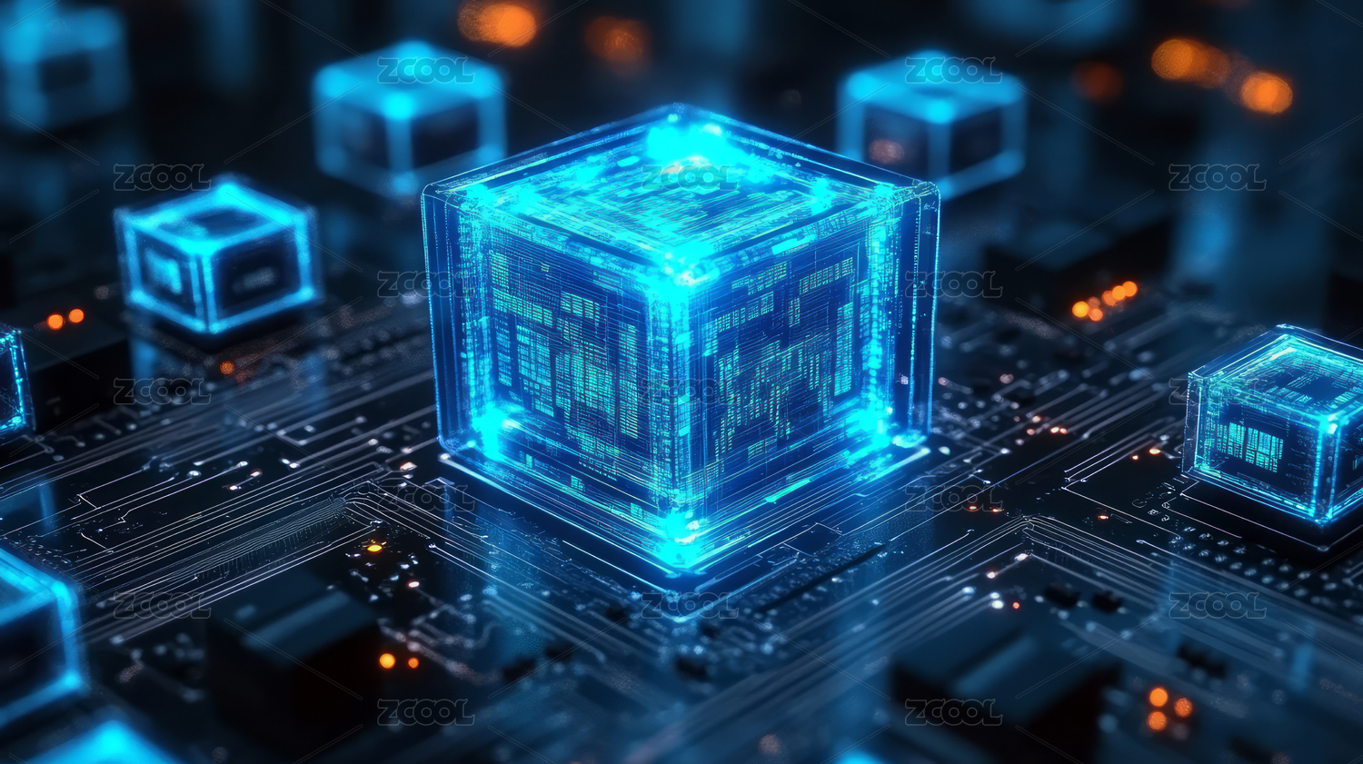 悬浮在深色电路板上方的发光蓝色立方芯片