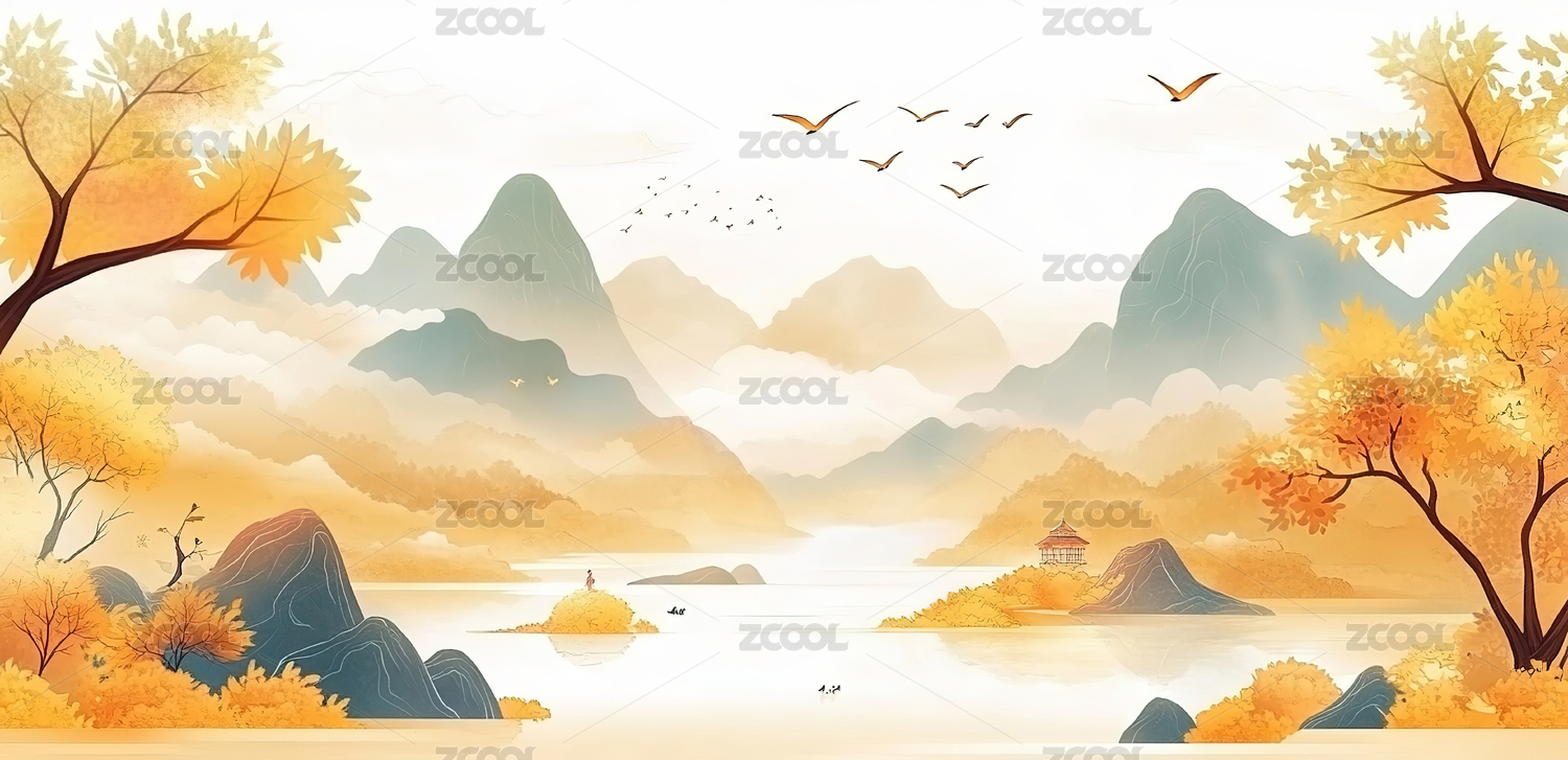 艺术,自然,橙色,黄色,中国,绘画,风景,传统,美丽,颜色