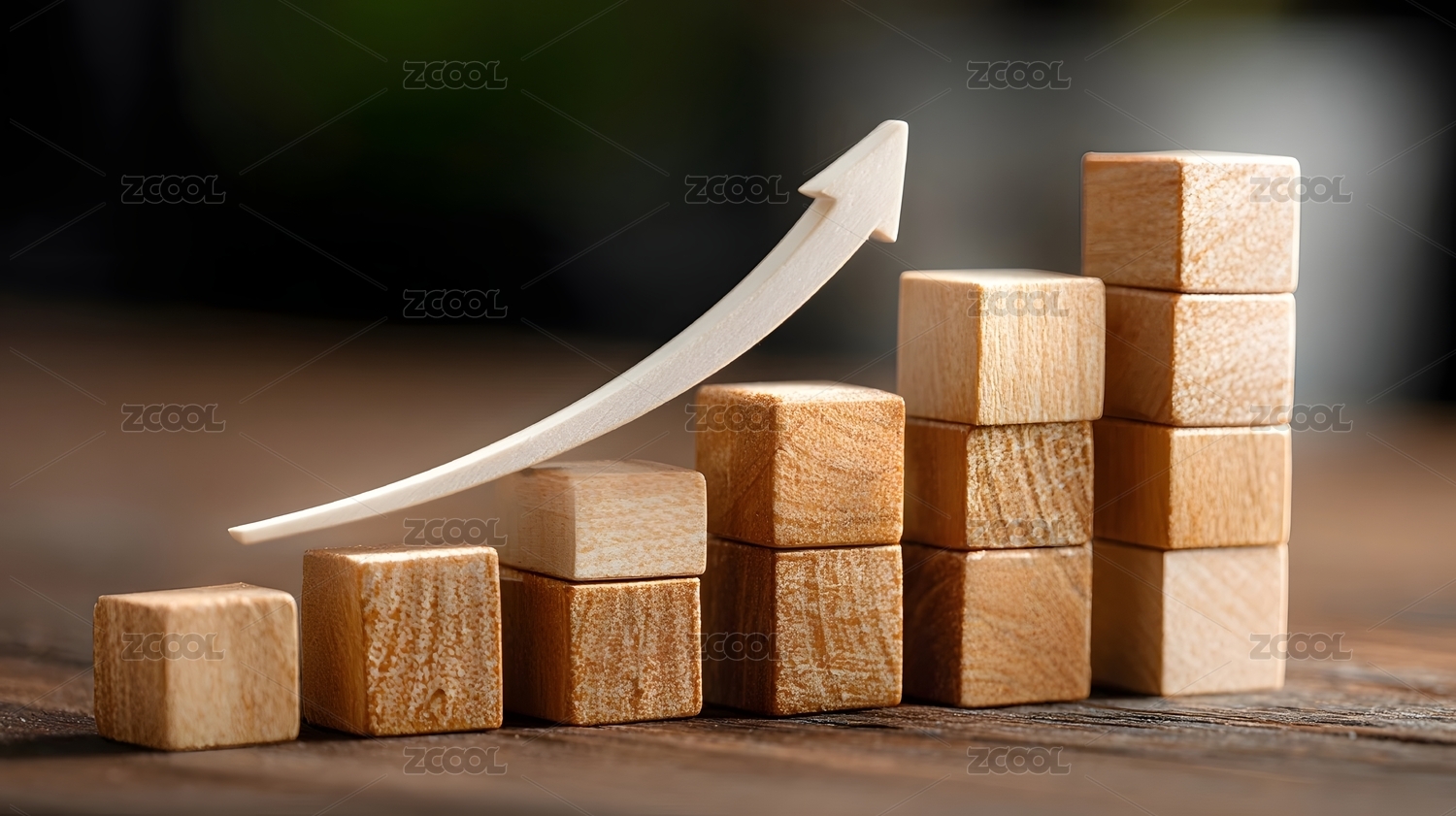 深色背景中象征增长的木质方块与箭头