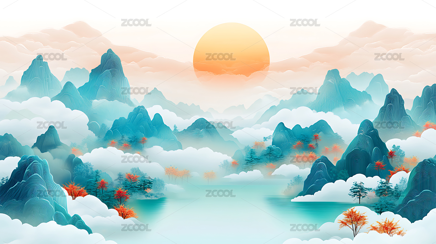 新国风古风国潮青绿山水画水墨传统背景壁纸