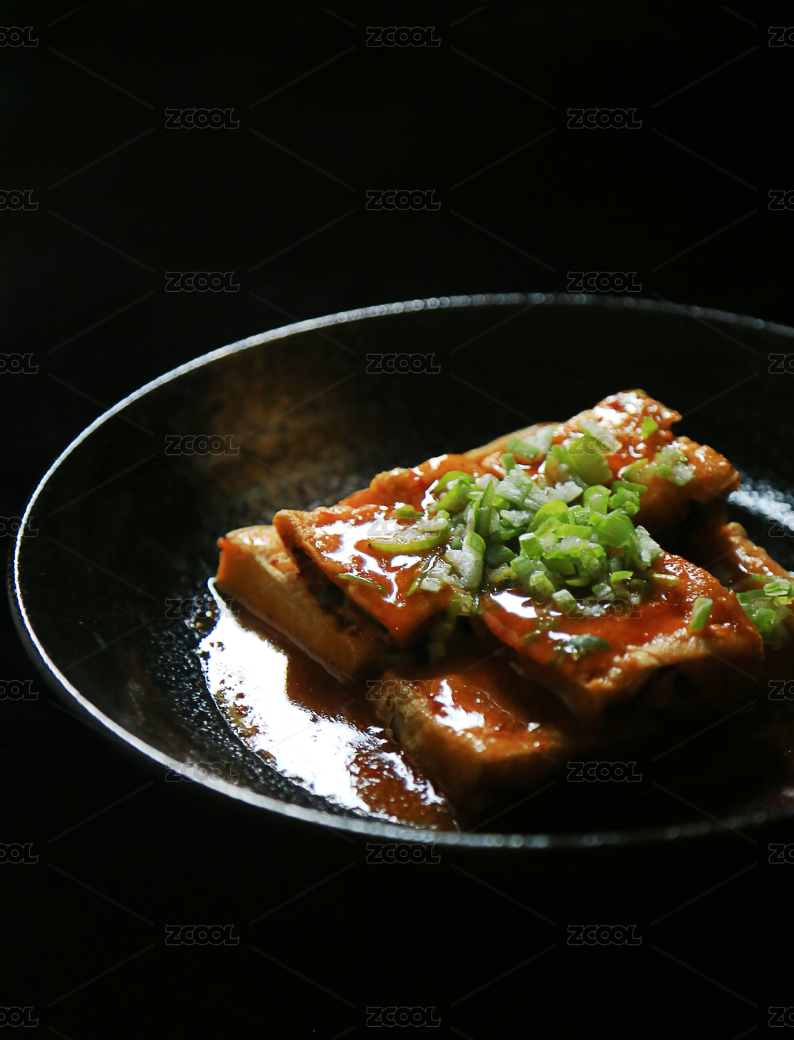 黑背景上黑色陶瓷盘里的几块臭豆腐,上面撒着葱花