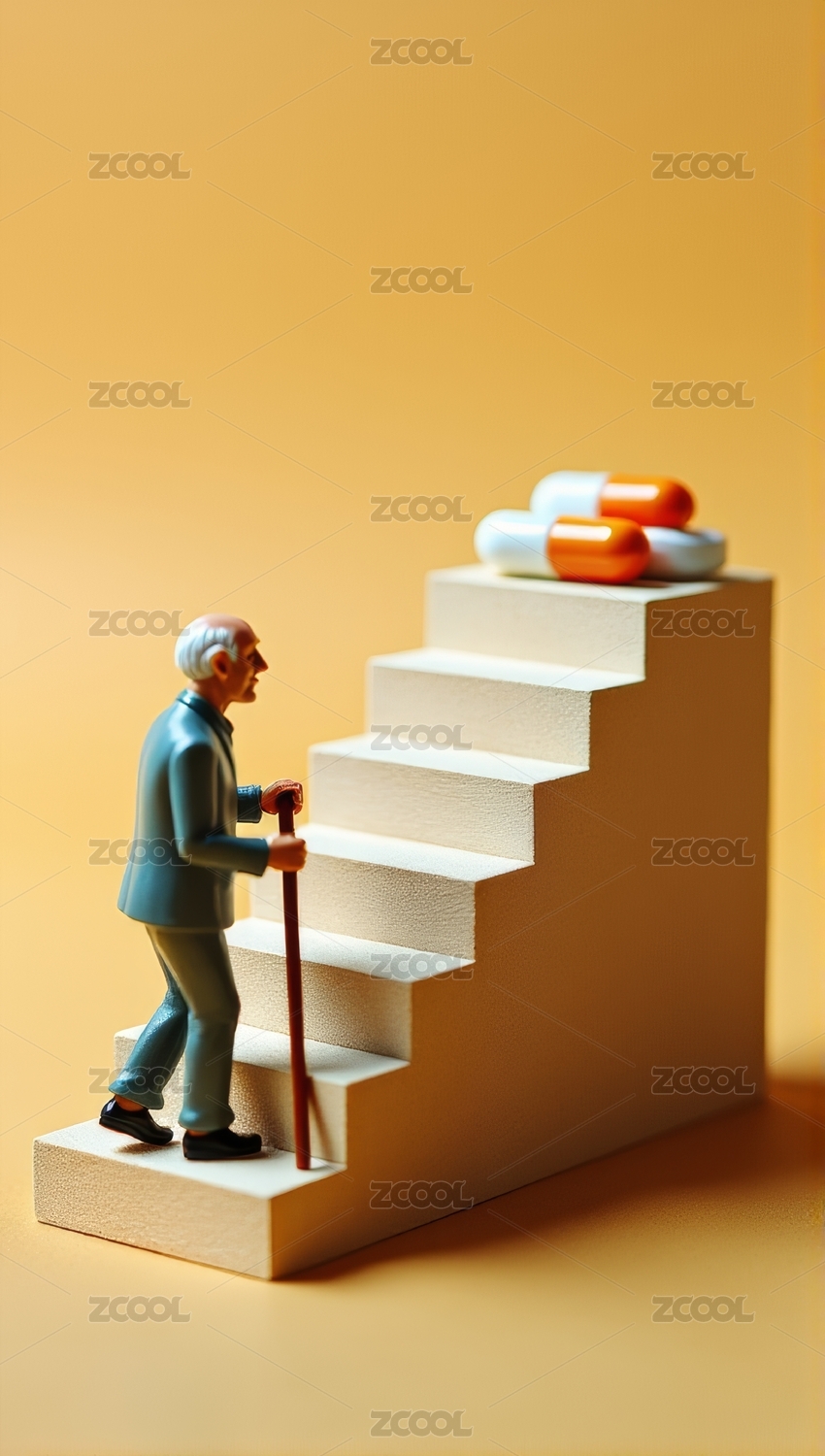 微缩创意台阶原木色上阶梯的老年人与胶囊药