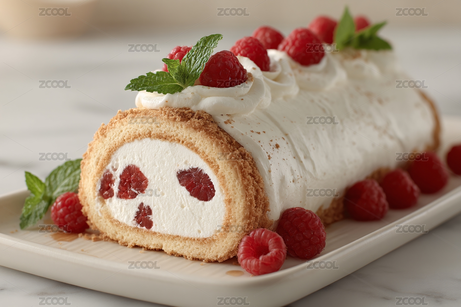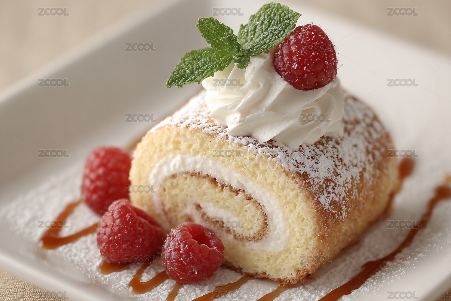 一盘鲜牛乳蛋糕卷摆放在桌面上特写