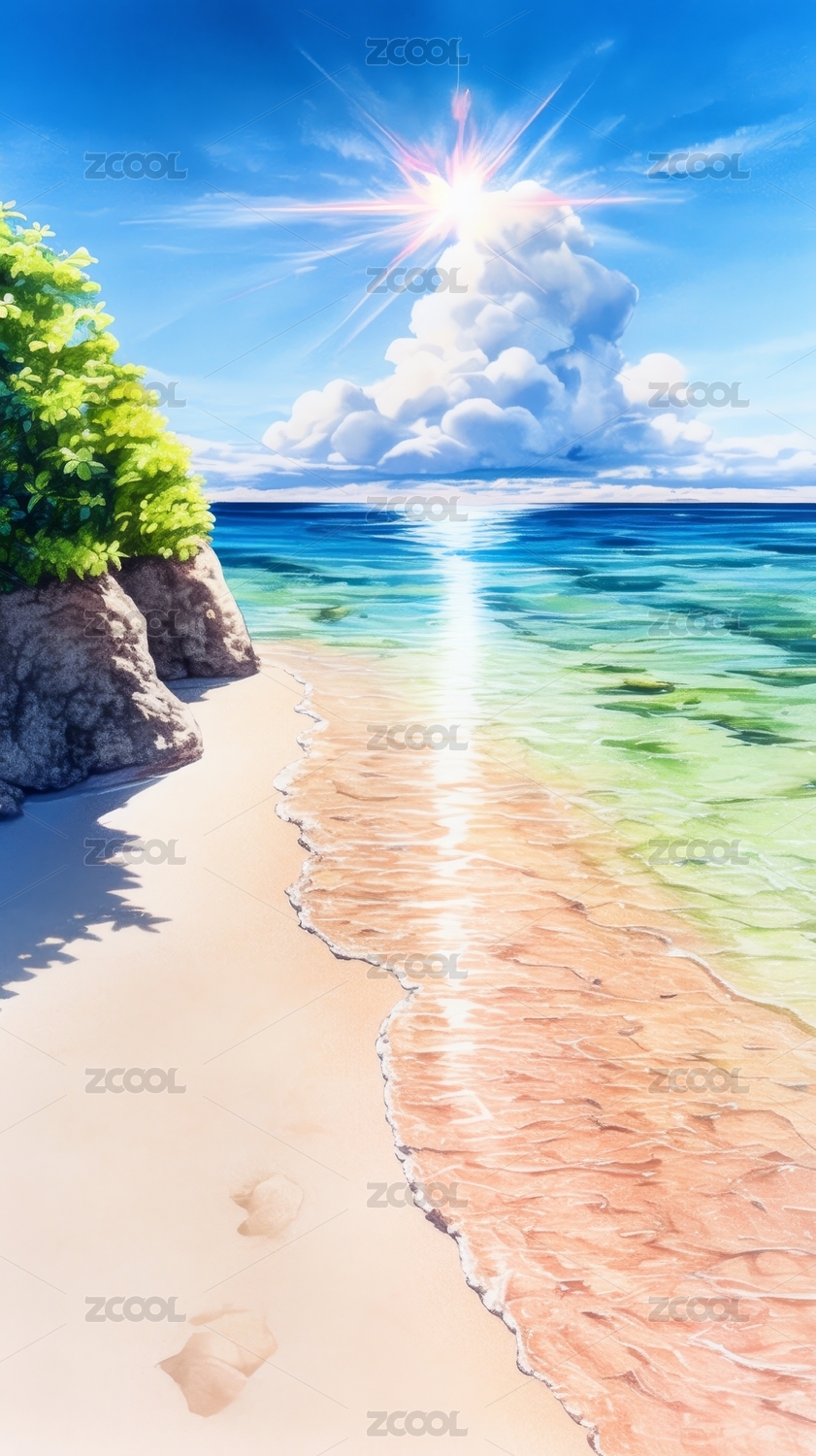 夏季晴朗沙滩有长青苔岩石的海边绘画插画
