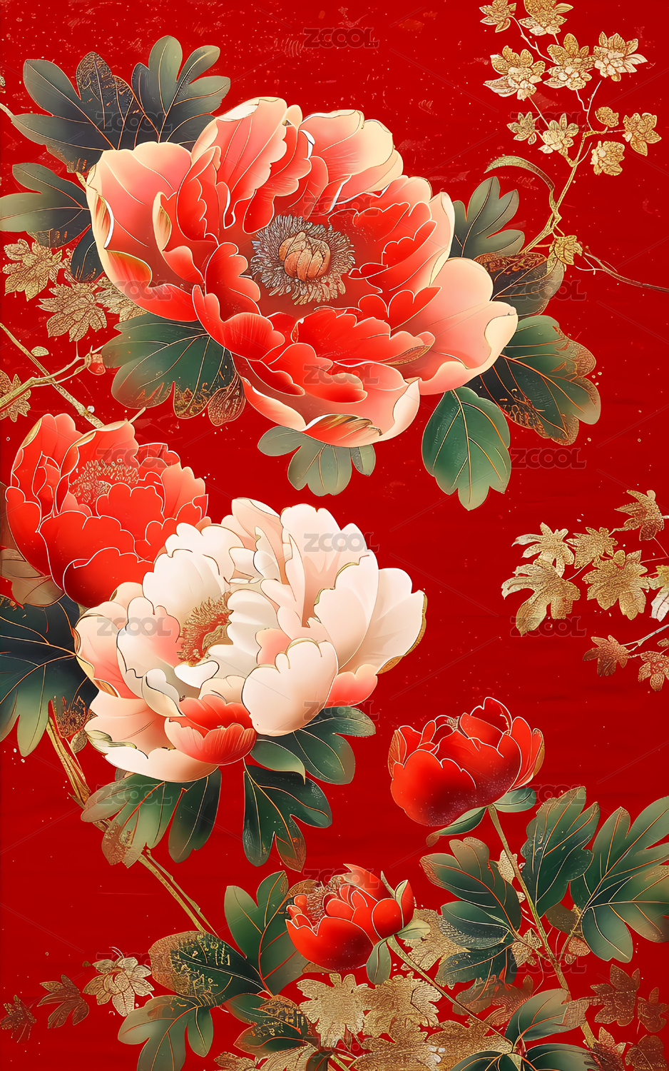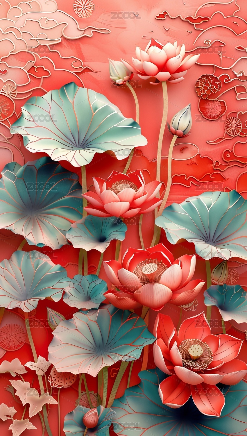 荷花,红色,金色,插画,装饰,传统,艺术,花卉,华丽,国风