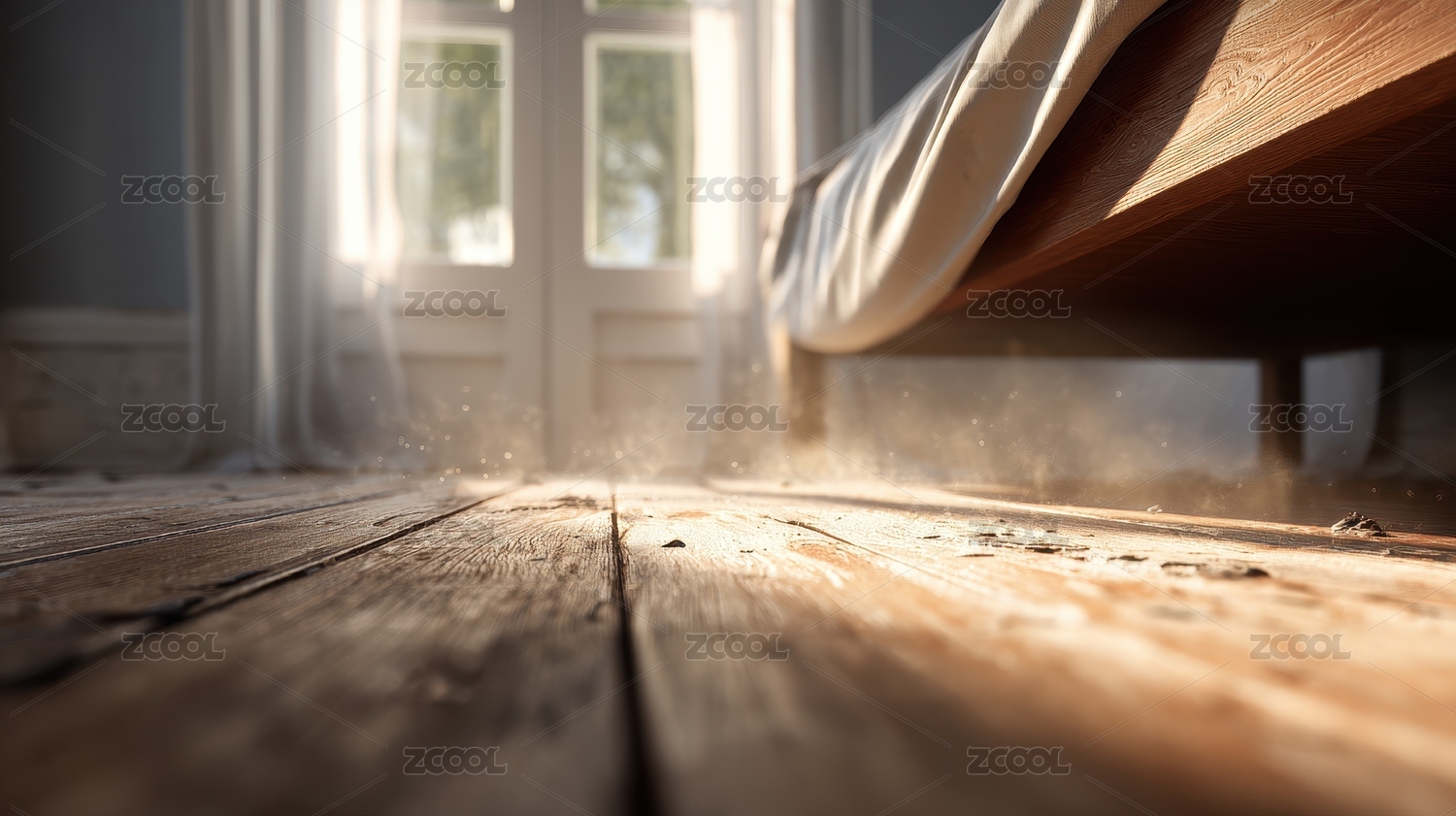 阳光洒进的尘土木地板