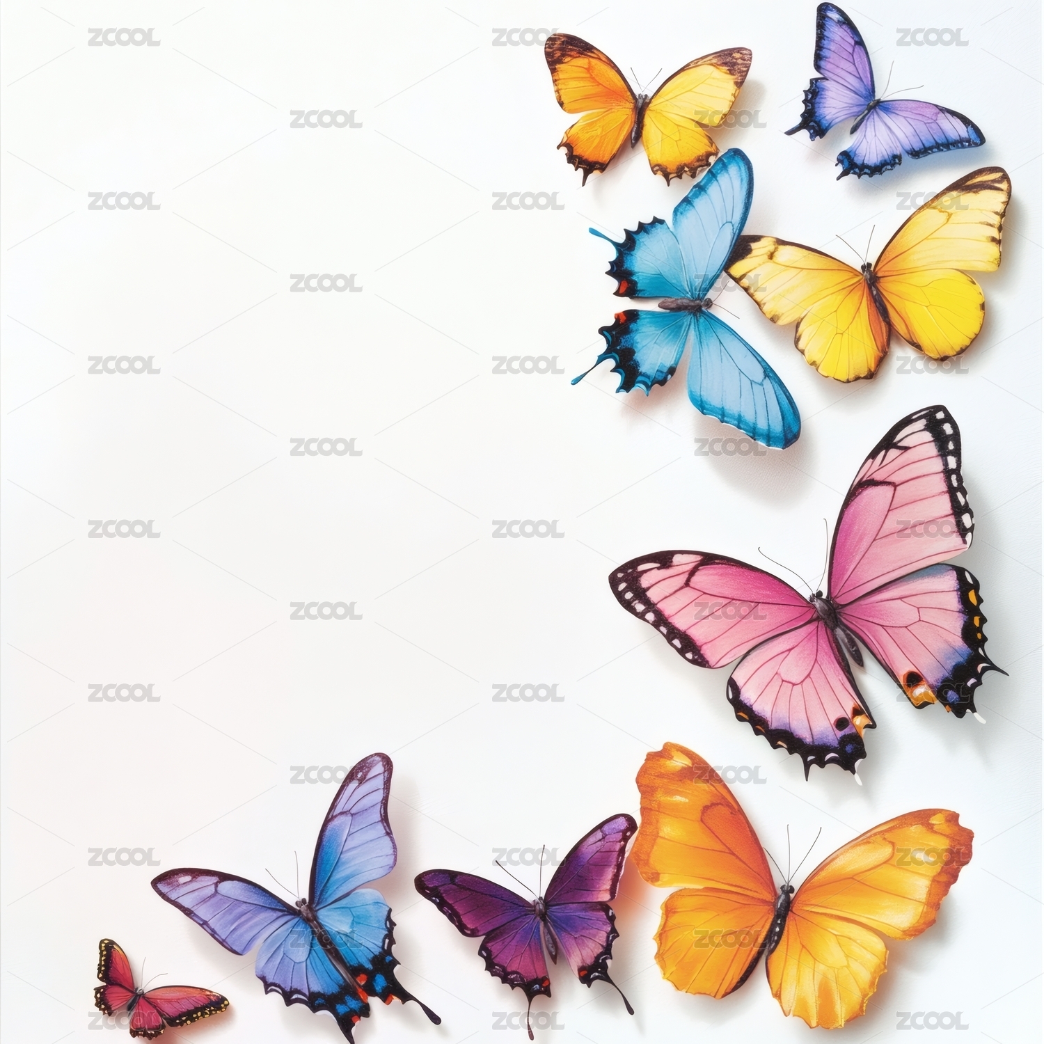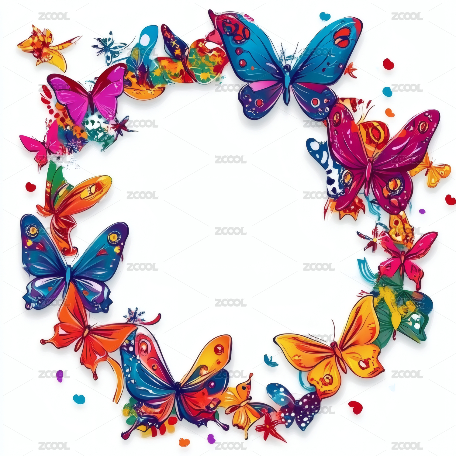多彩蝴蝶环绕的空白背景画面