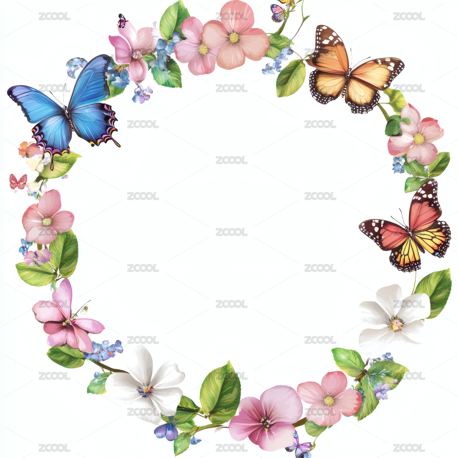 五彩蝴蝶与花朵环绕的美丽花环