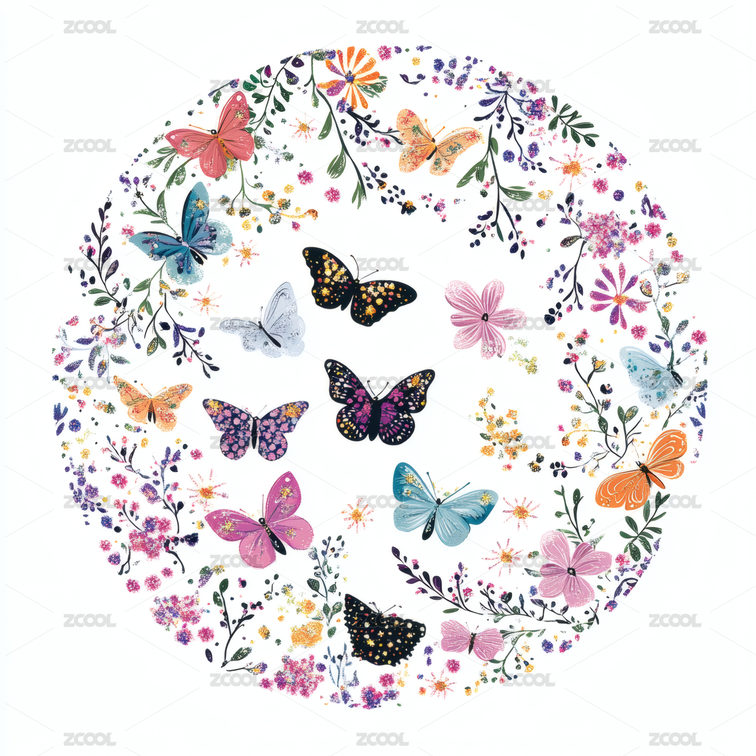彩色蝴蝶与花朵环绕的圆形图案