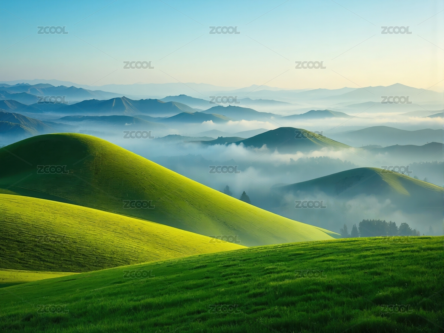 晨雾中的绿色丘陵