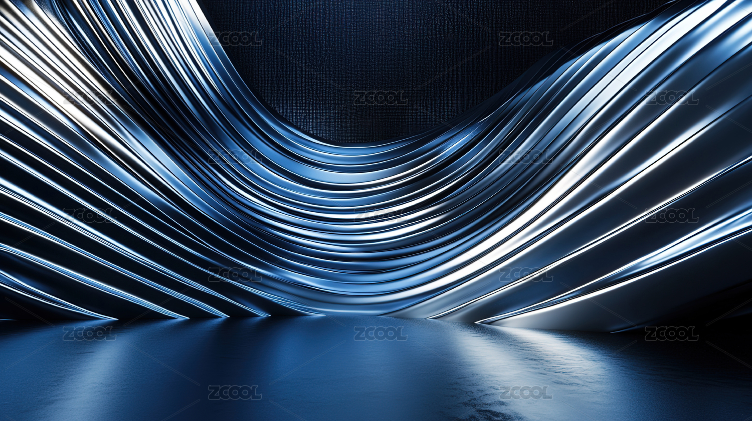 银色室内空的展台与弯曲的线条墙壁3D渲染