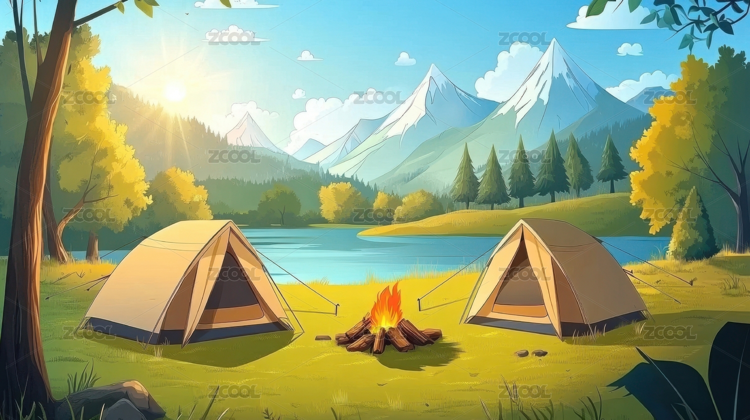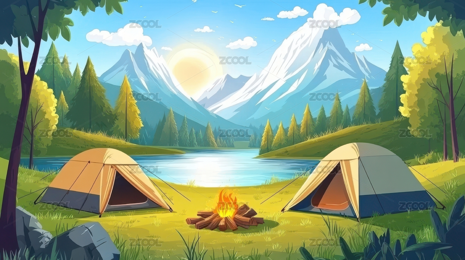 帐篷,房车,篝火,山脉,湖泊,松树,露营,自然,户外,风景