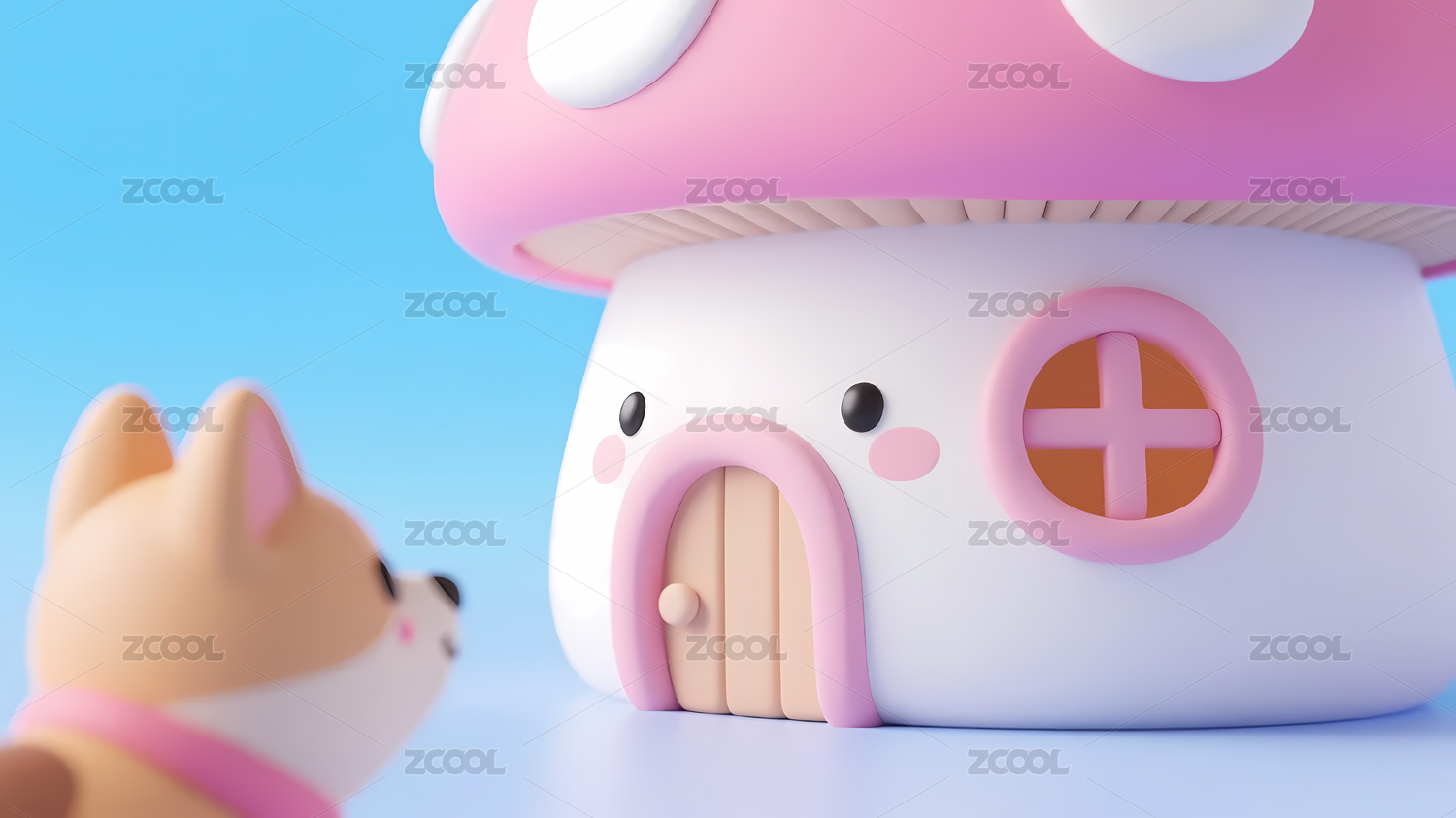 粉色蘑菇房子和小狗