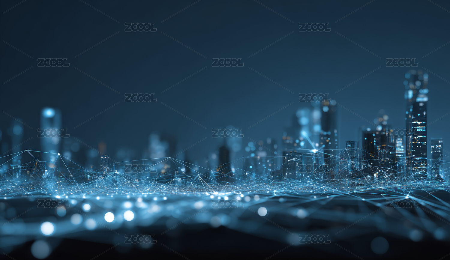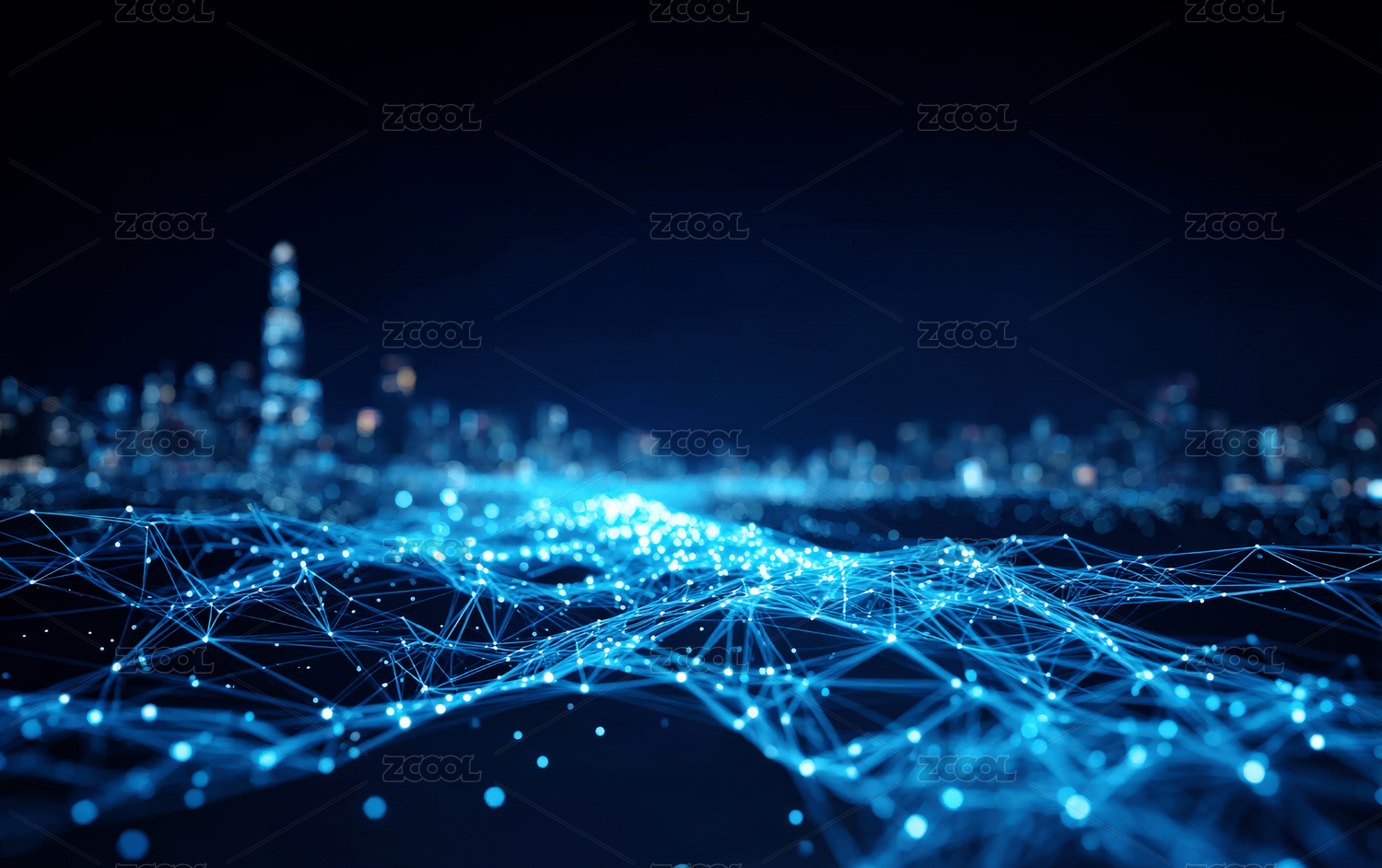 夜幕下城市与数据波纹交织的科技景观