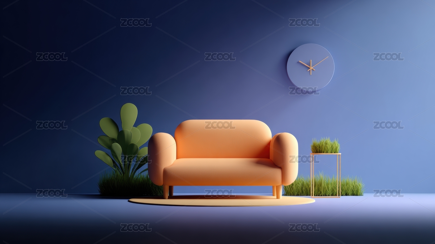 现代,装饰,简约,橙色,植物,沙发,蓝色,家具,客厅,室内设计