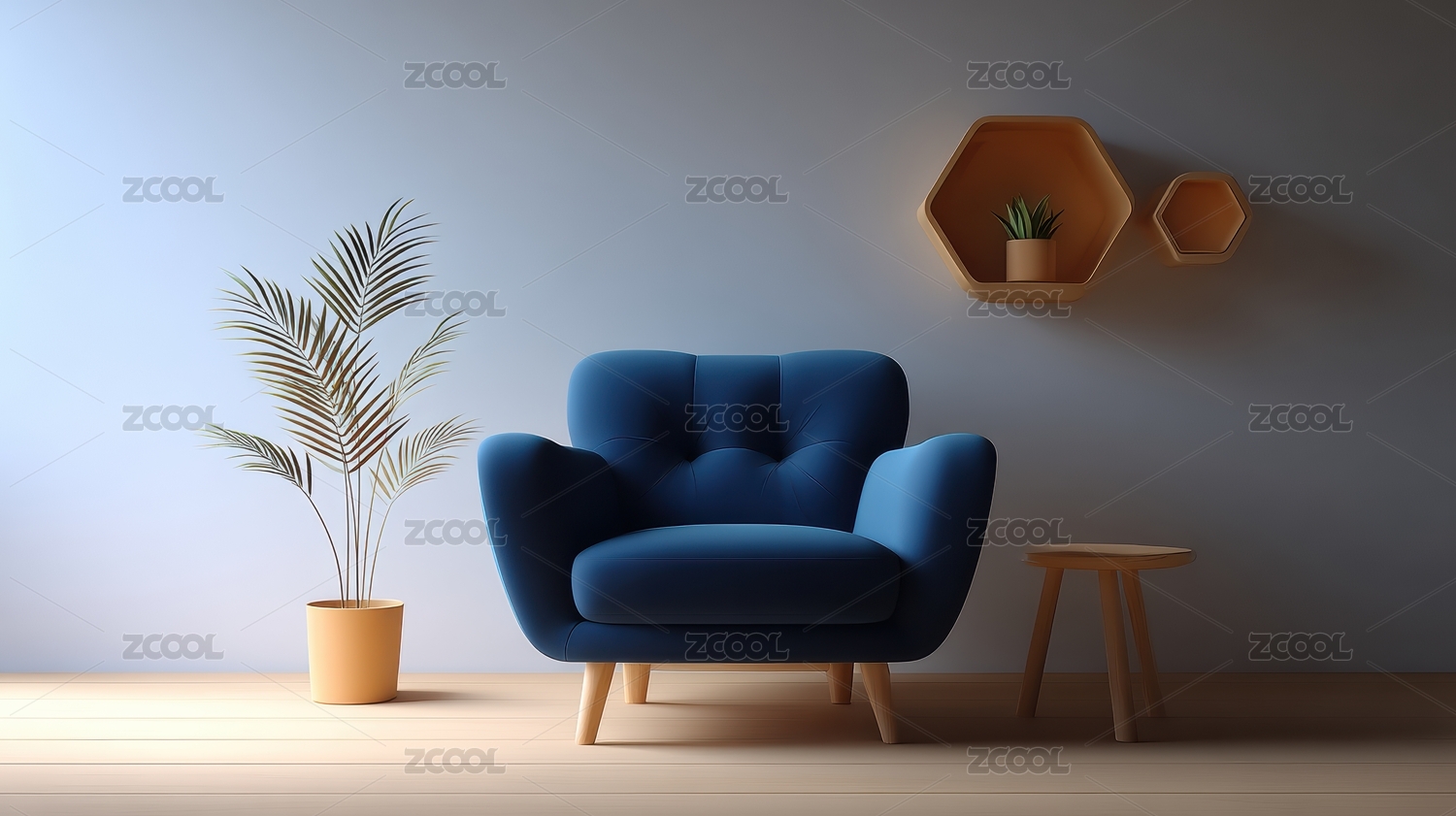 现代简约客厅中的蓝色扶手椅与绿植装饰
