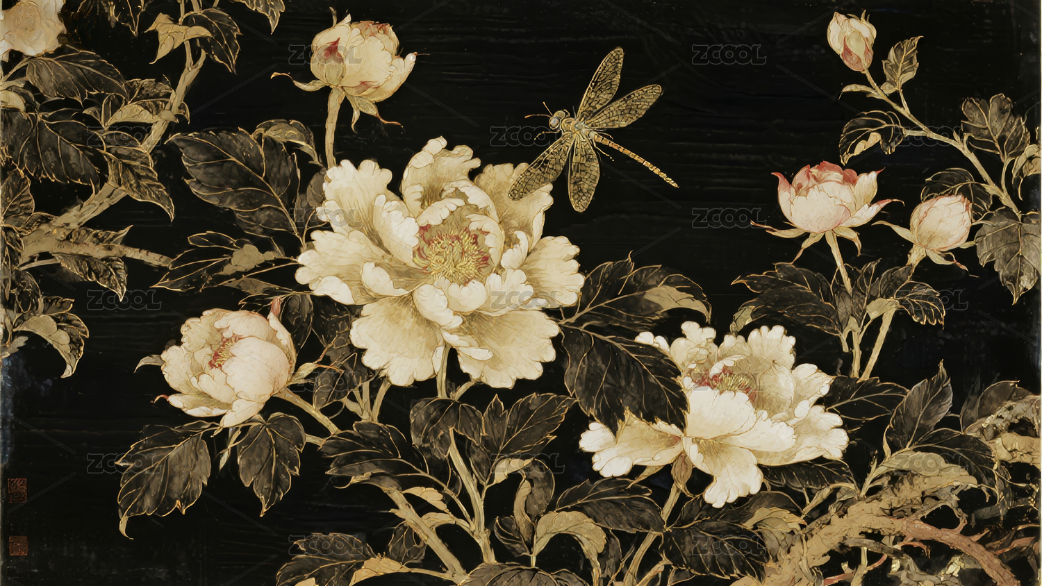 牡丹花,工笔,线描,中式,传统,背景,壁纸,蜻蜓,极细金丝线描,黑色背景