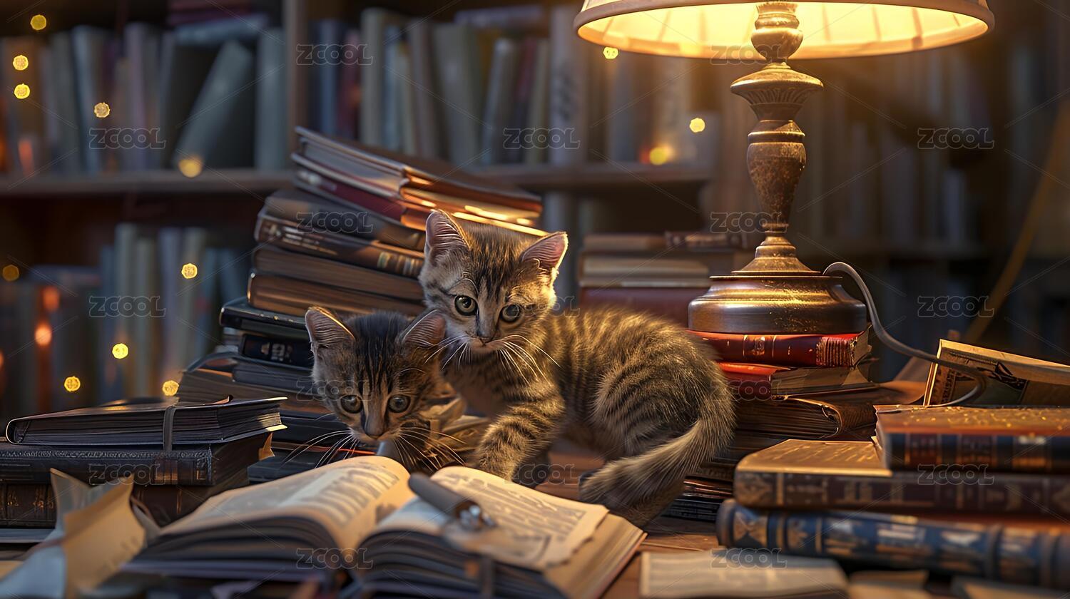 温馨图书馆里的小猫嬉戏