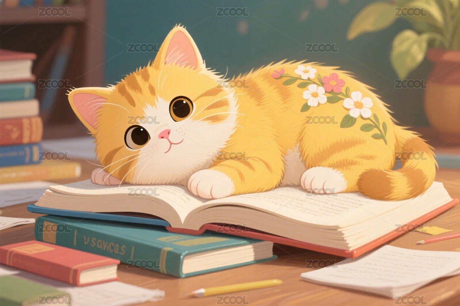 一只小猫趴在书本上卡通插画