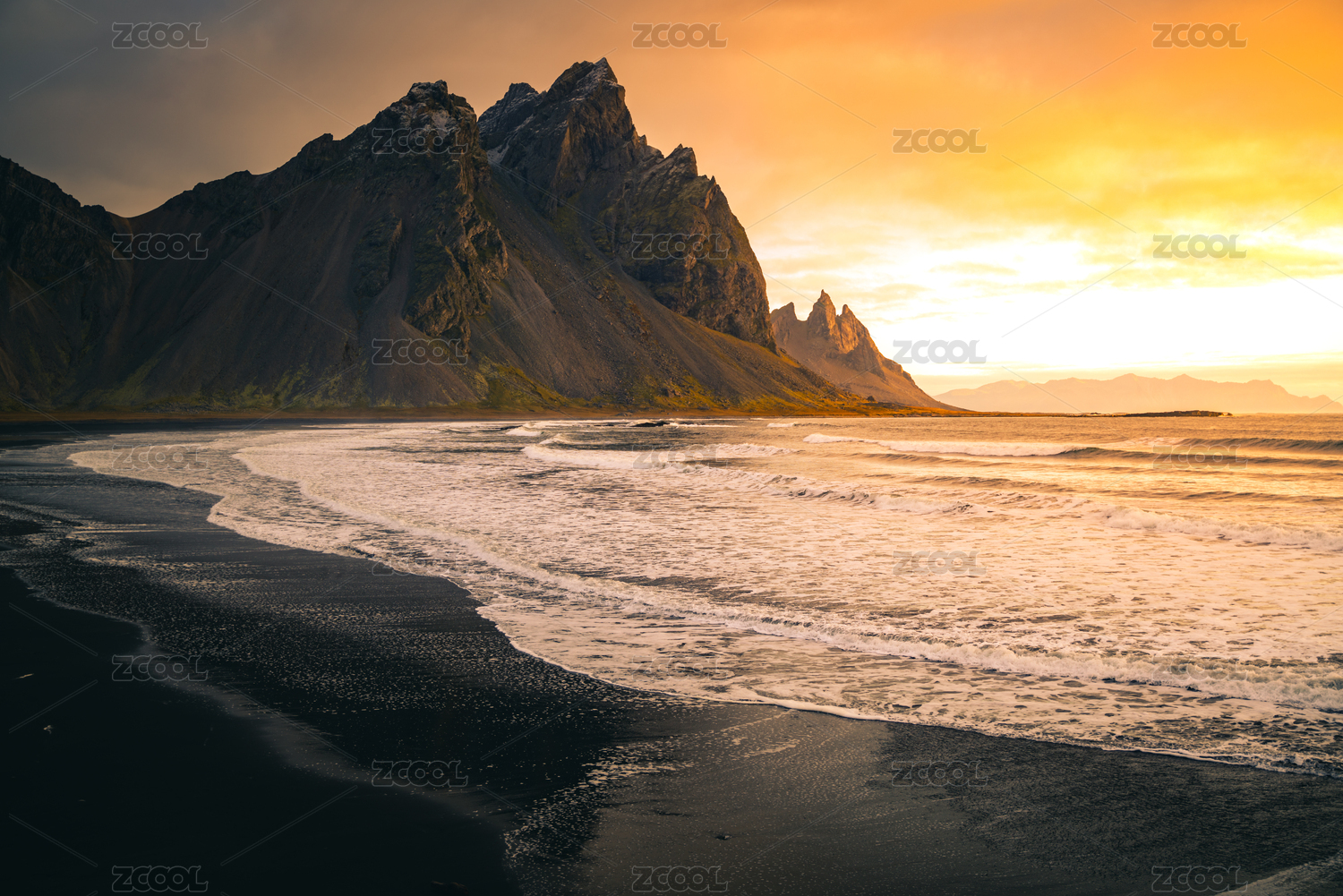 冰岛黑沙滩上的苔藓岩石与山脉日落