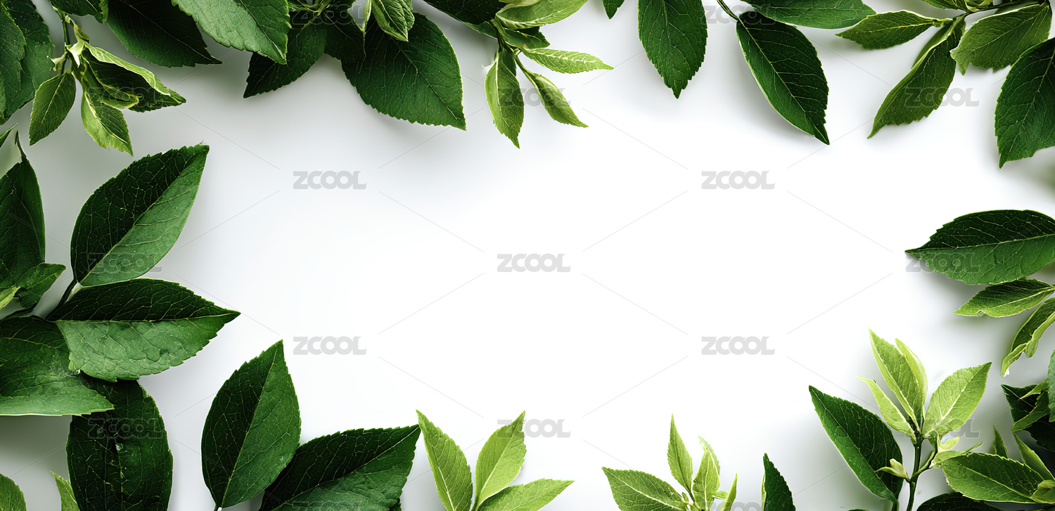 白色背景下飞舞在空中的新鲜绿叶的特写镜头