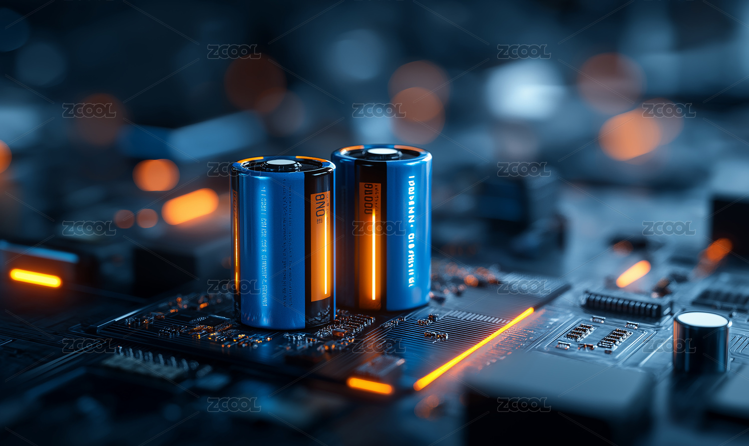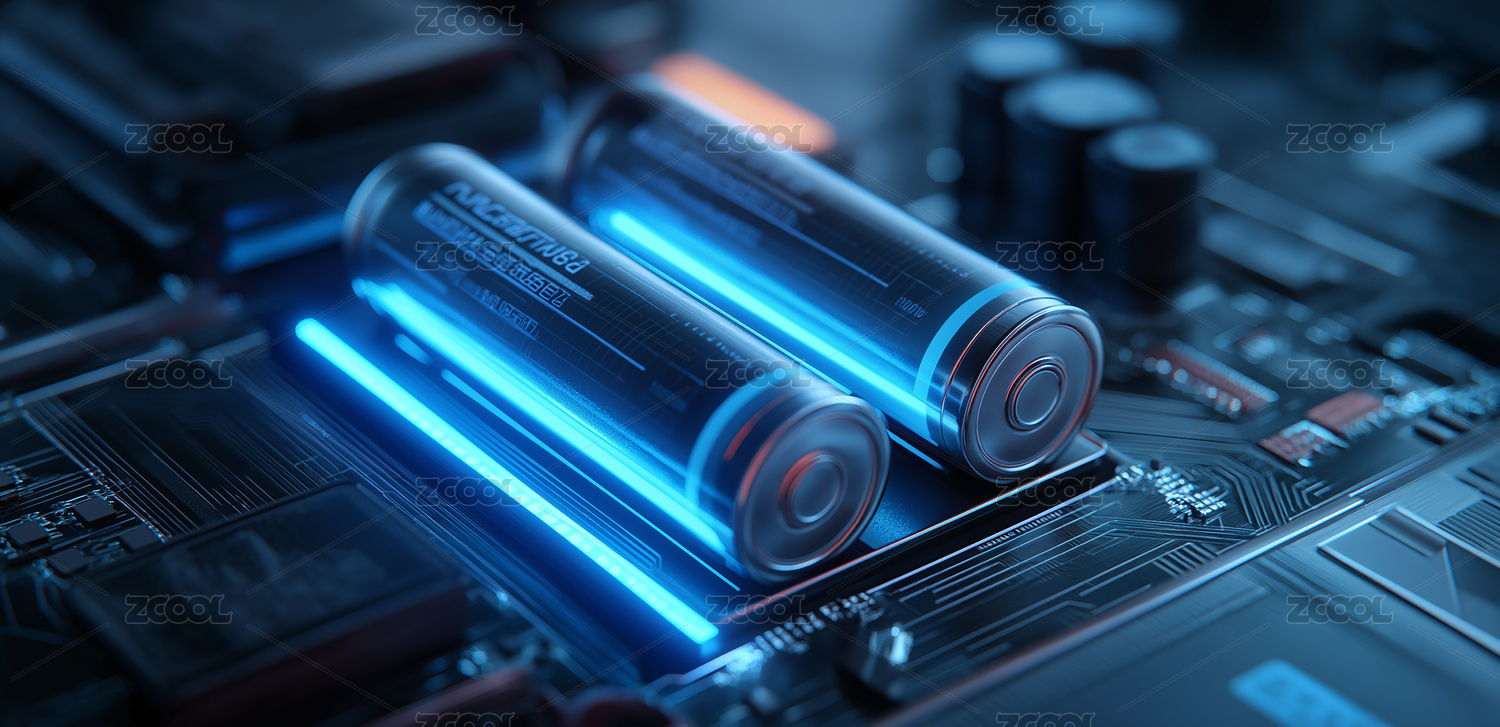 电路板上蓝色电池散发科技光效