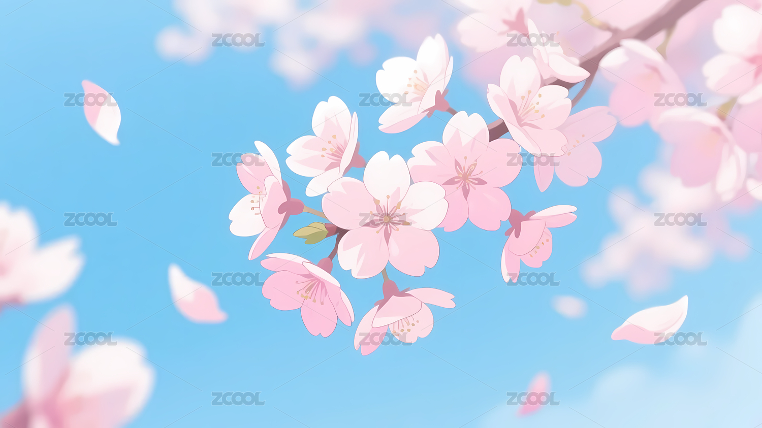 粉色樱花飘落淡蓝背景