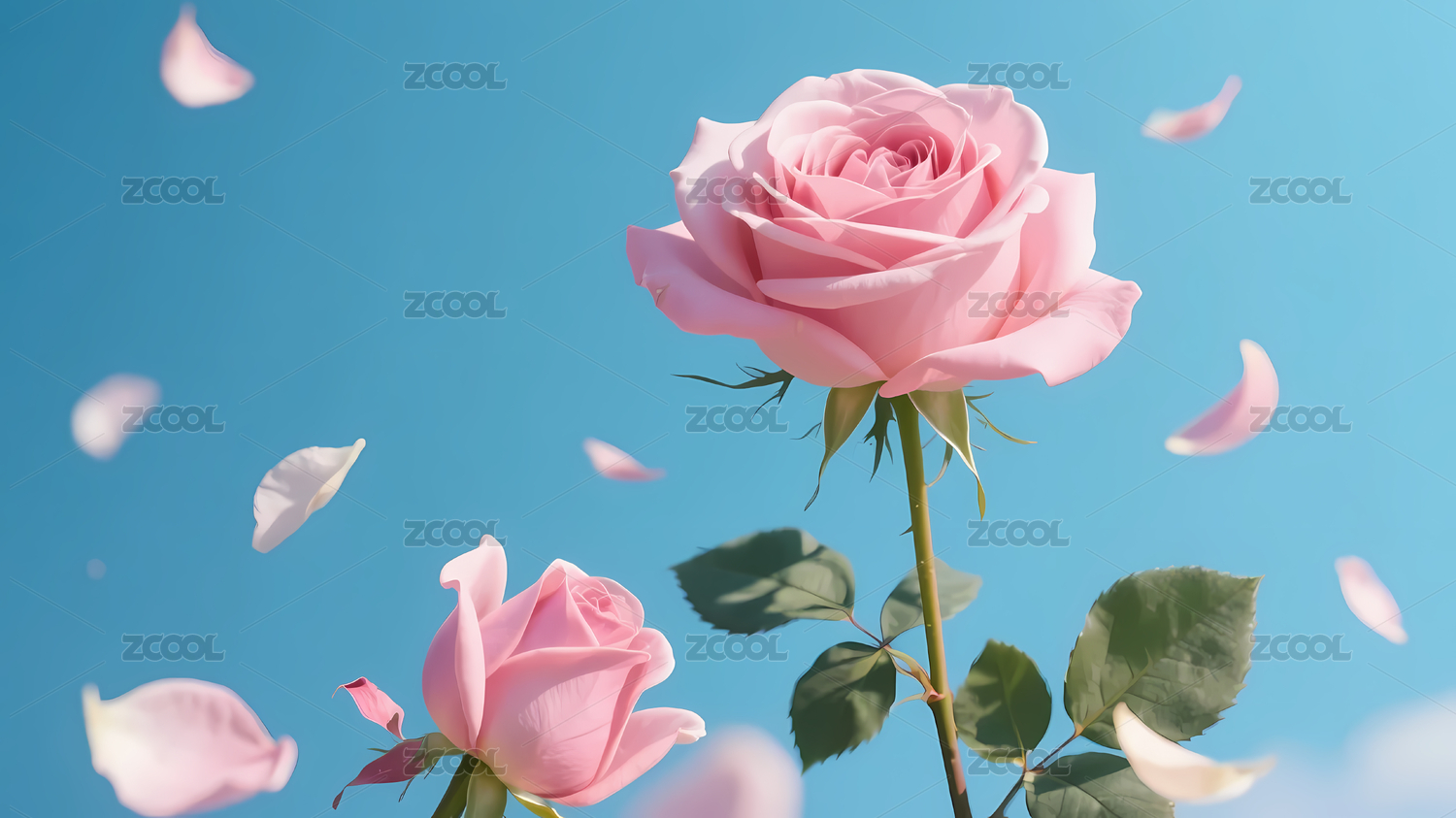 粉色玫瑰与花瓣点缀的天空画面