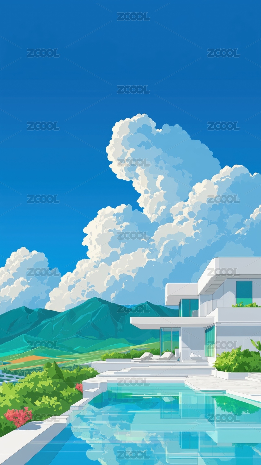 清新,晴朗,山脚,别墅,游泳池,水彩,色块,插画,天气,白云
