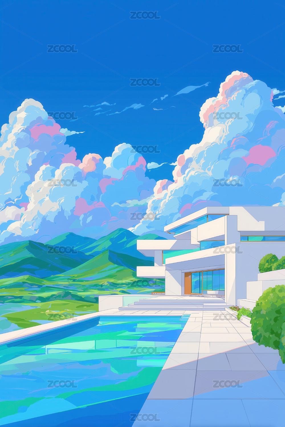 清新晴朗山脚下别墅前的游泳池手绘水彩插画