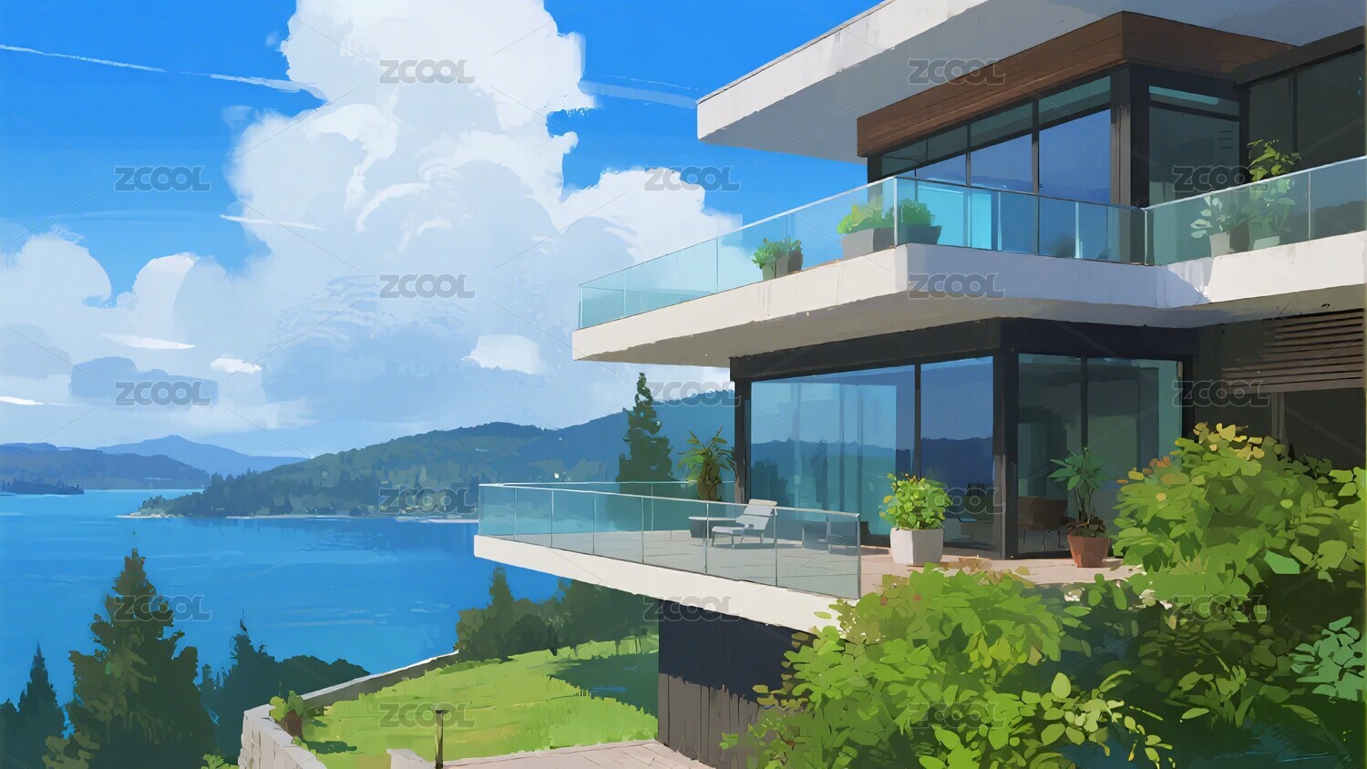 海边现代风格的别墅插画