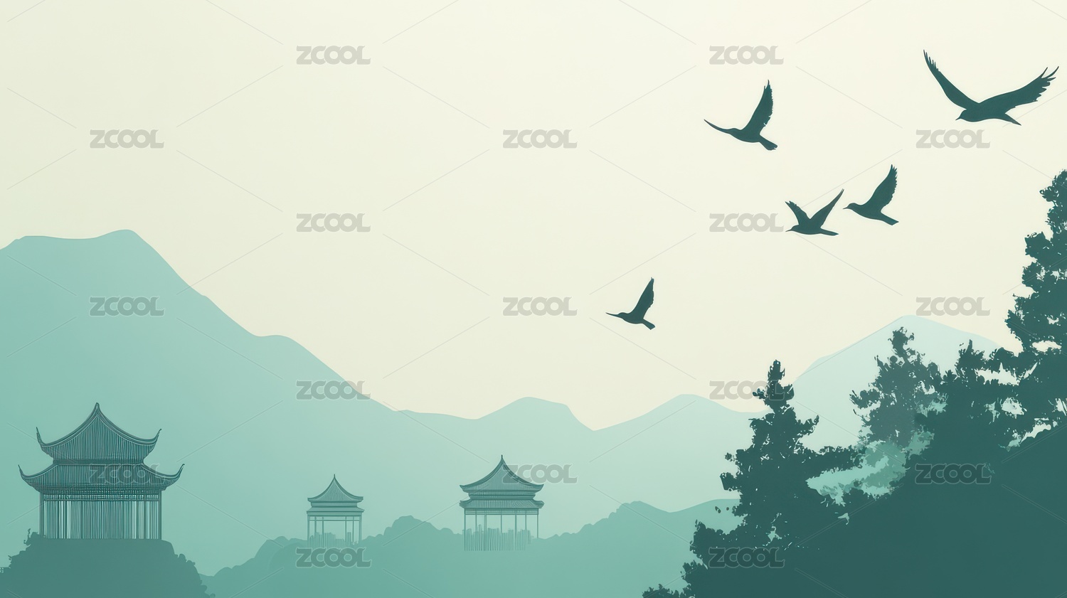 古风楼阁飞鸟掠过青山云雾