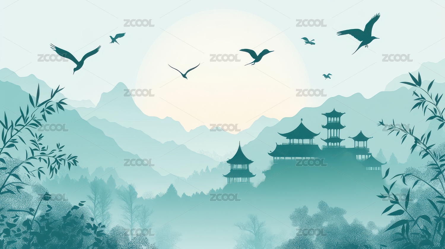 云雾缭绕的古建筑与飞鸟