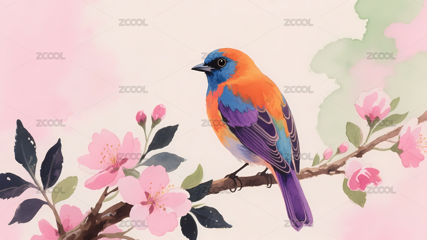 水彩画小鸟栖息枝头花朵盛开