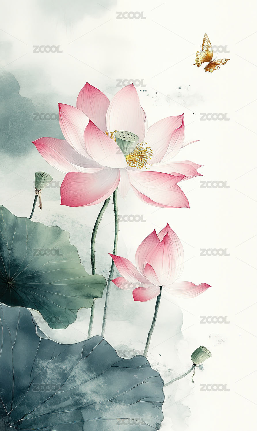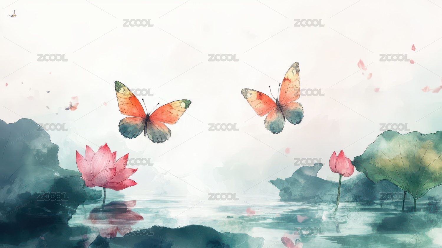 翩翩蝴蝶与粉红荷花的水墨画卷