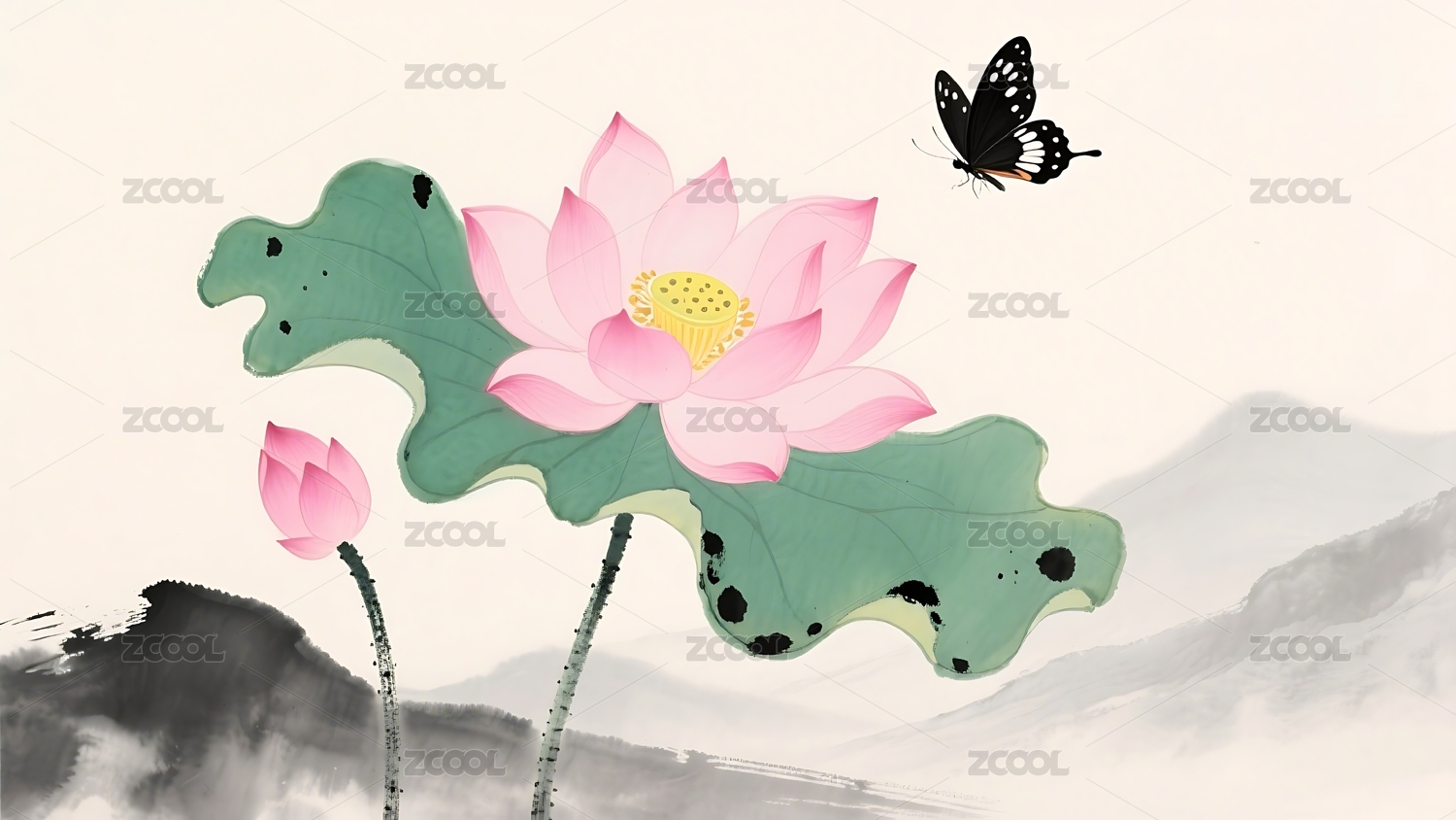 艺术,自然,淡雅,荷叶,莲花,水墨,和谐,蝴蝶,绘画